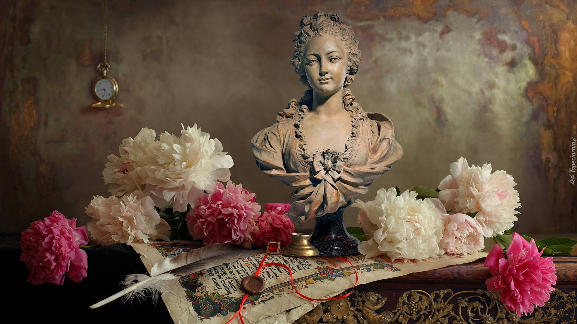 Edytor tapety: Popiersie kobiety obok piwonii
