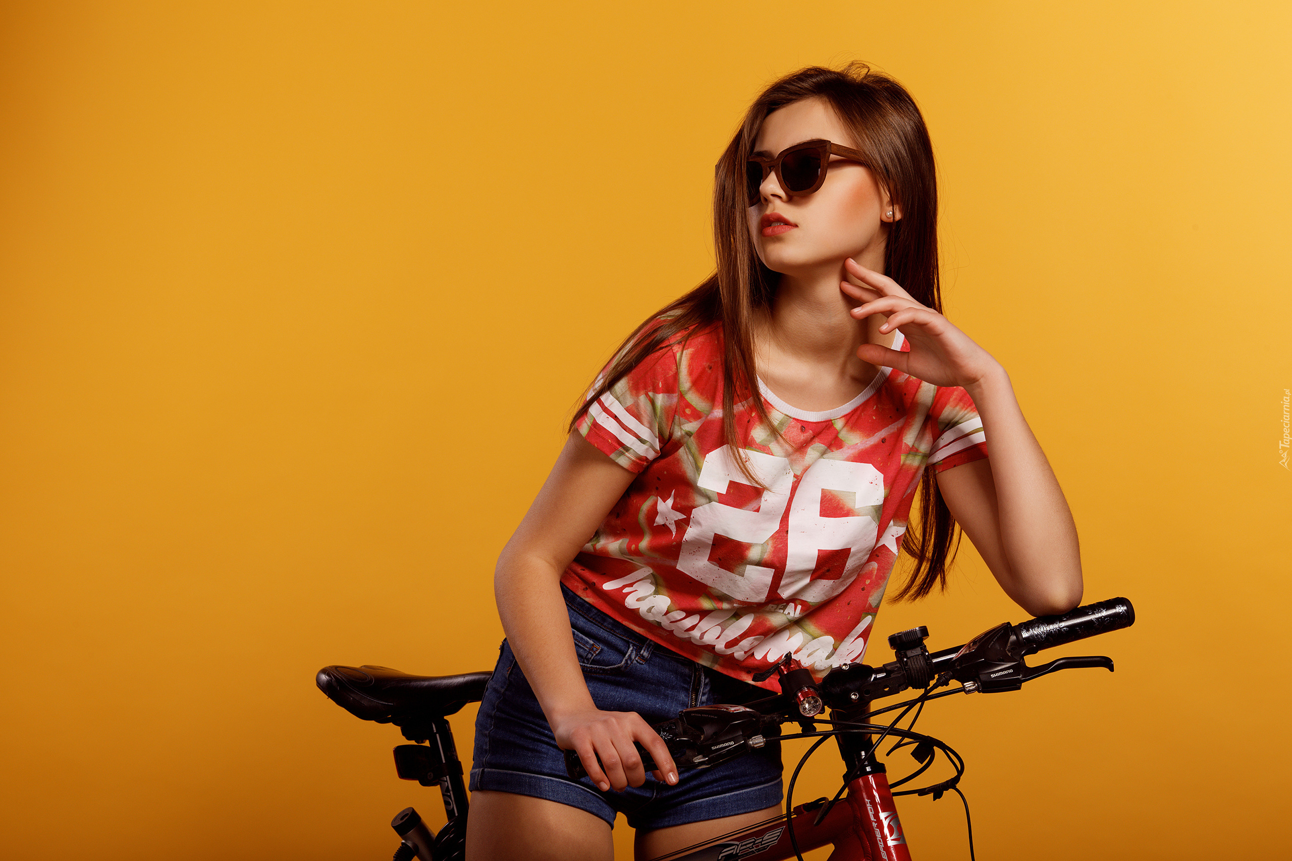 Edytor tapety: Dziewczyna w okularach i sportowej koszulce na rowerze
