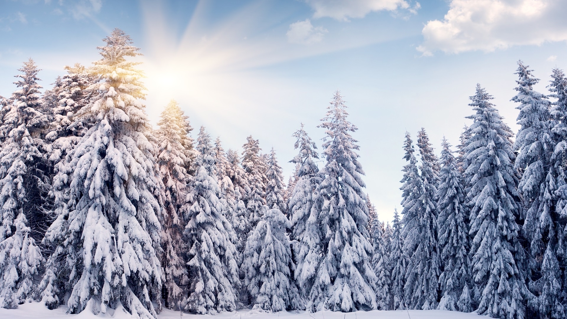 Edytor tapety: Ośnieżone świerki w promieniach zimowego słońca