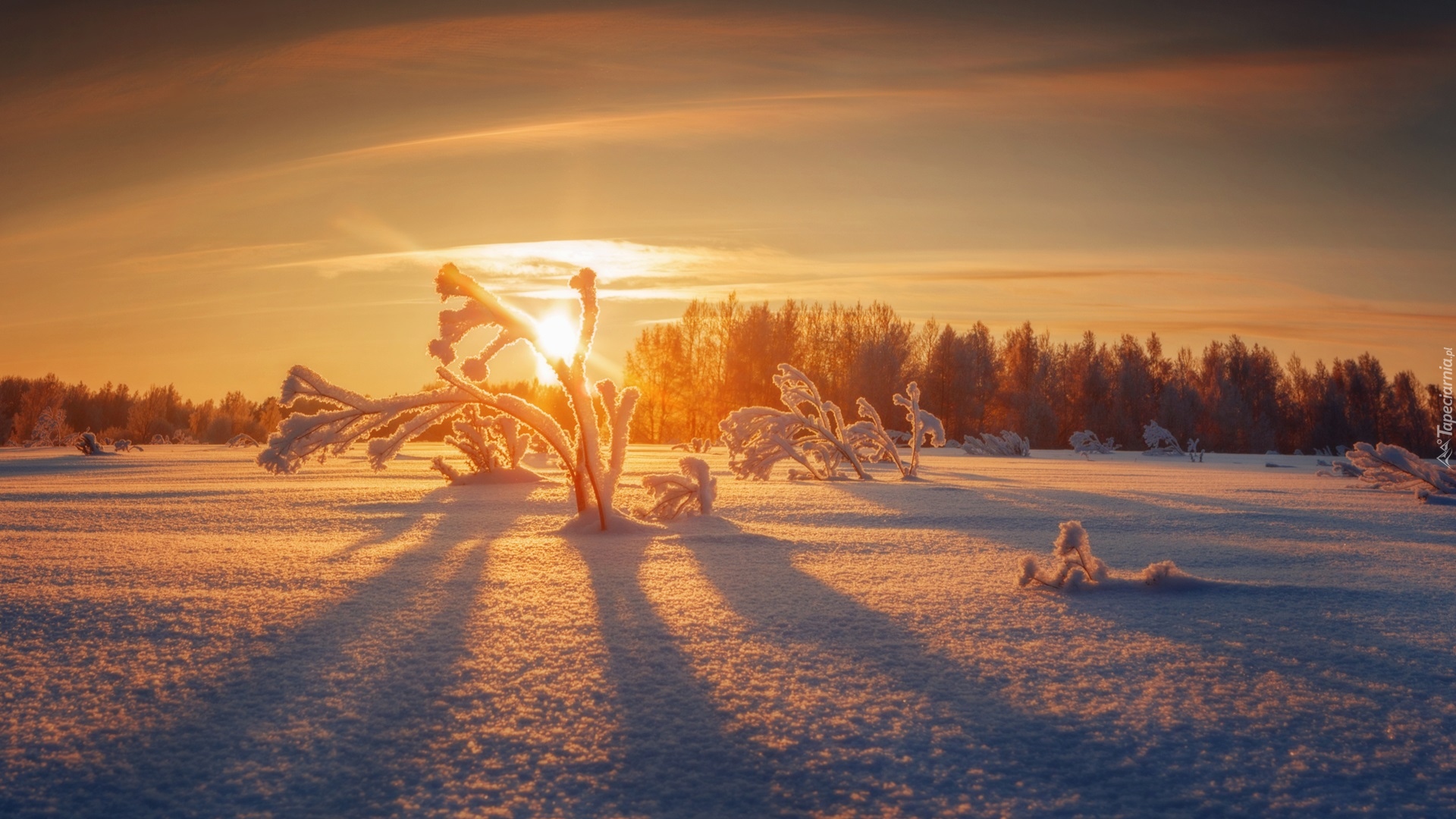 Edytor tapety: Oszronione krzewy na polu w blasku wschodzącego słońca