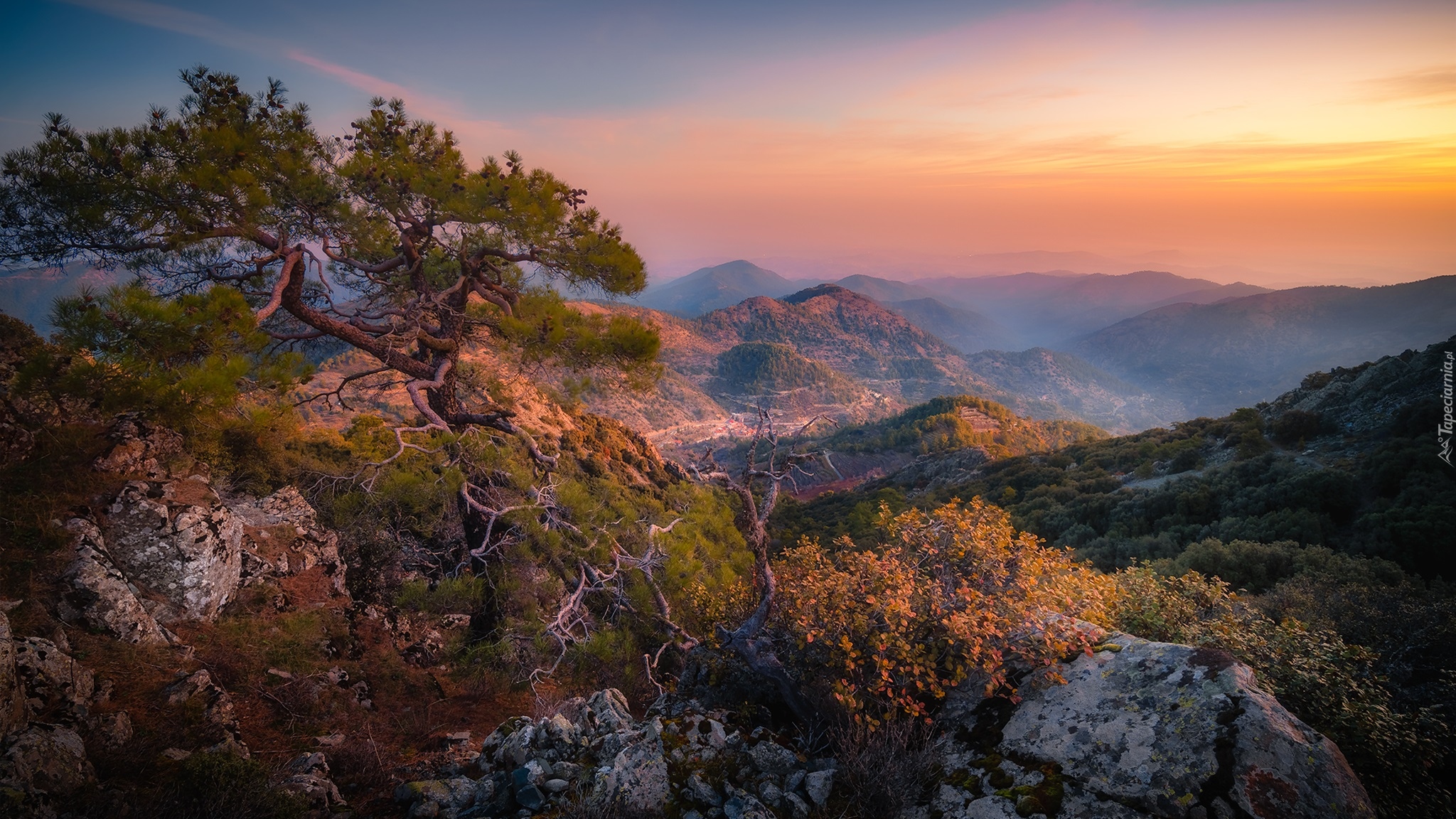 Edytor tapety: Sosna na skale z widokiem na góry Troodos