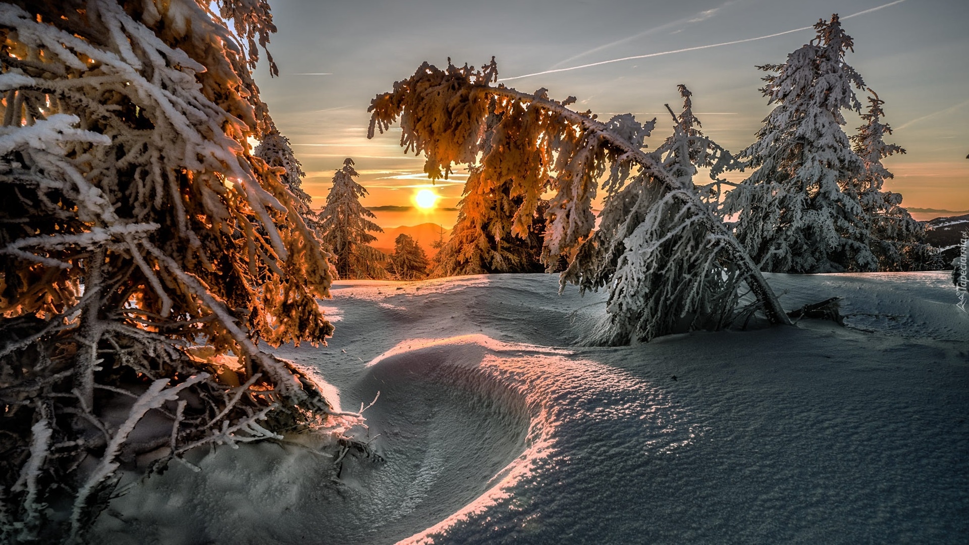 Edytor tapety: Ośnieżone drzewa w zaspach w blasku wschodzącego słońca