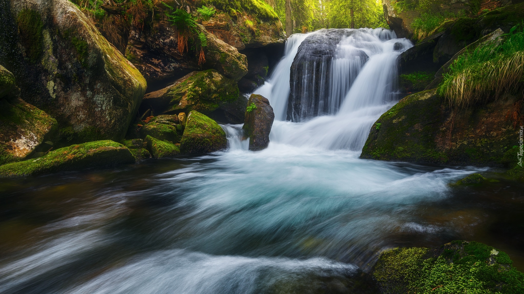 Edytor tapety: Omszałe głazy przy leśnym wodospadzie na rzece