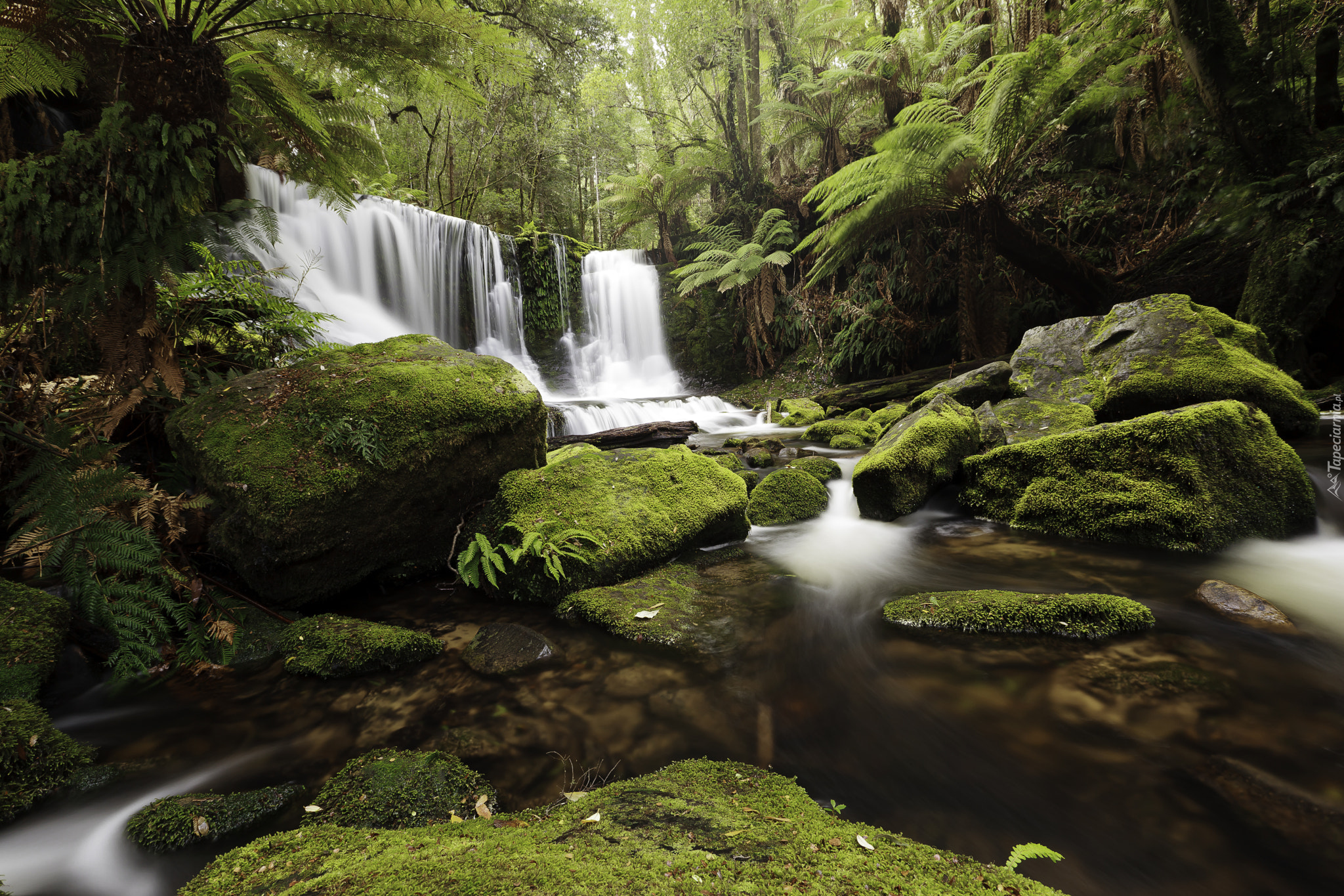 Edytor tapety: Omszałe kamienie i wodospad w zielonym lesie