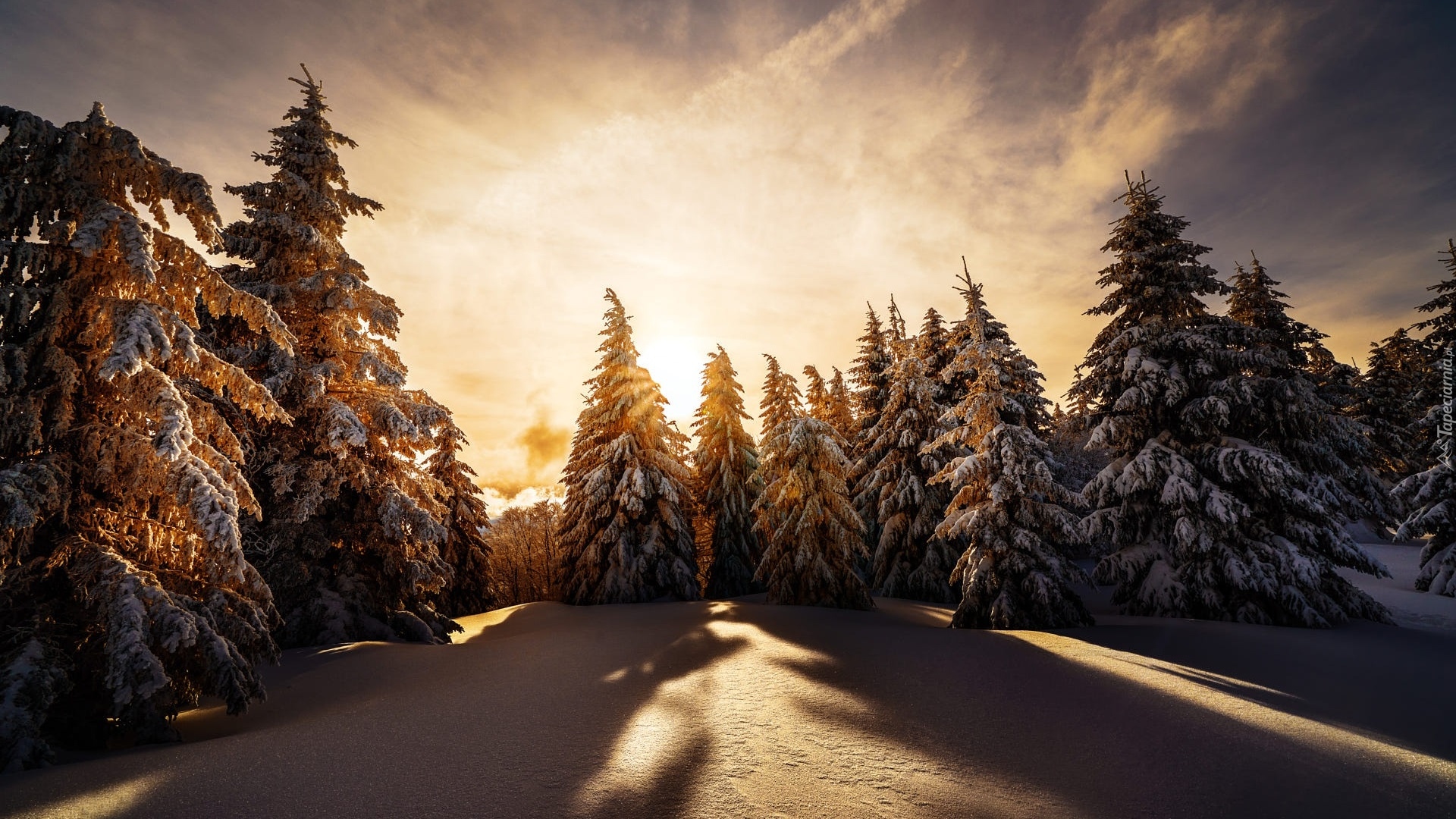 Edytor tapety: Ośnieżone drzewa w na tle wschodzącego słońca