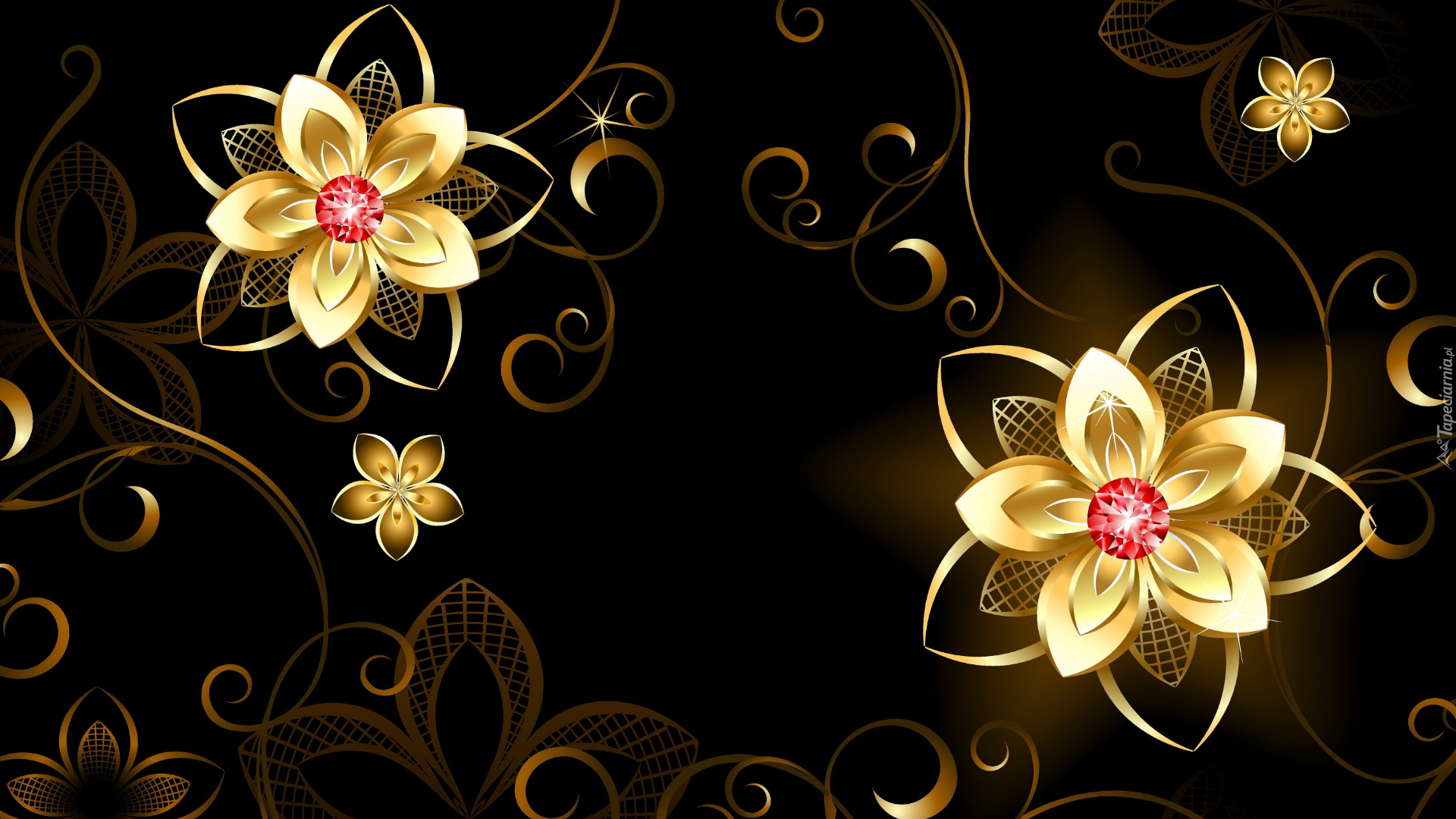 Edytor tapety: Złote kwiatki na czarnym tle w 2D