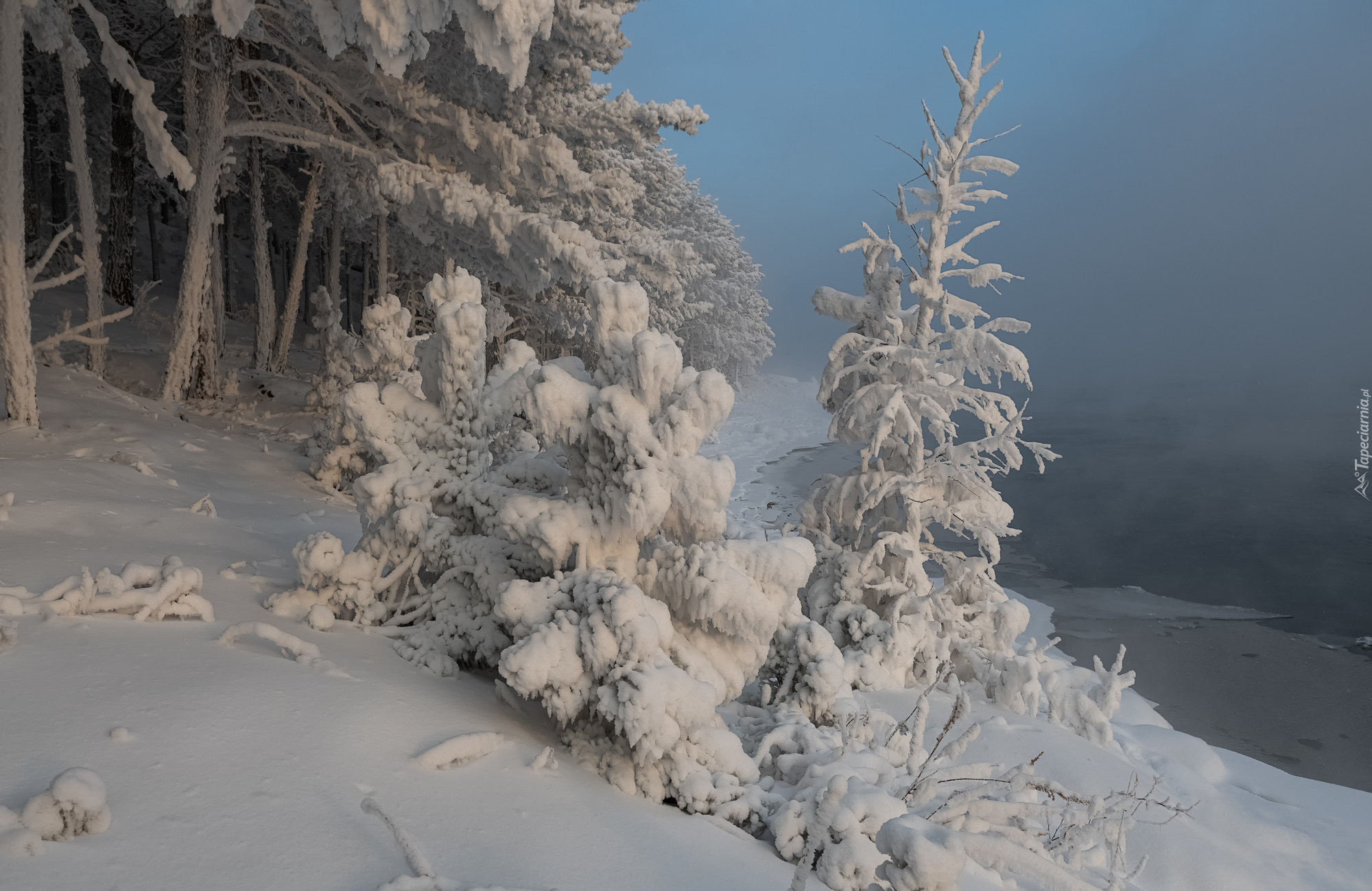 Edytor tapety: Ośnieżone drzewa i rośliny obok zamglonej rzeki