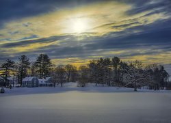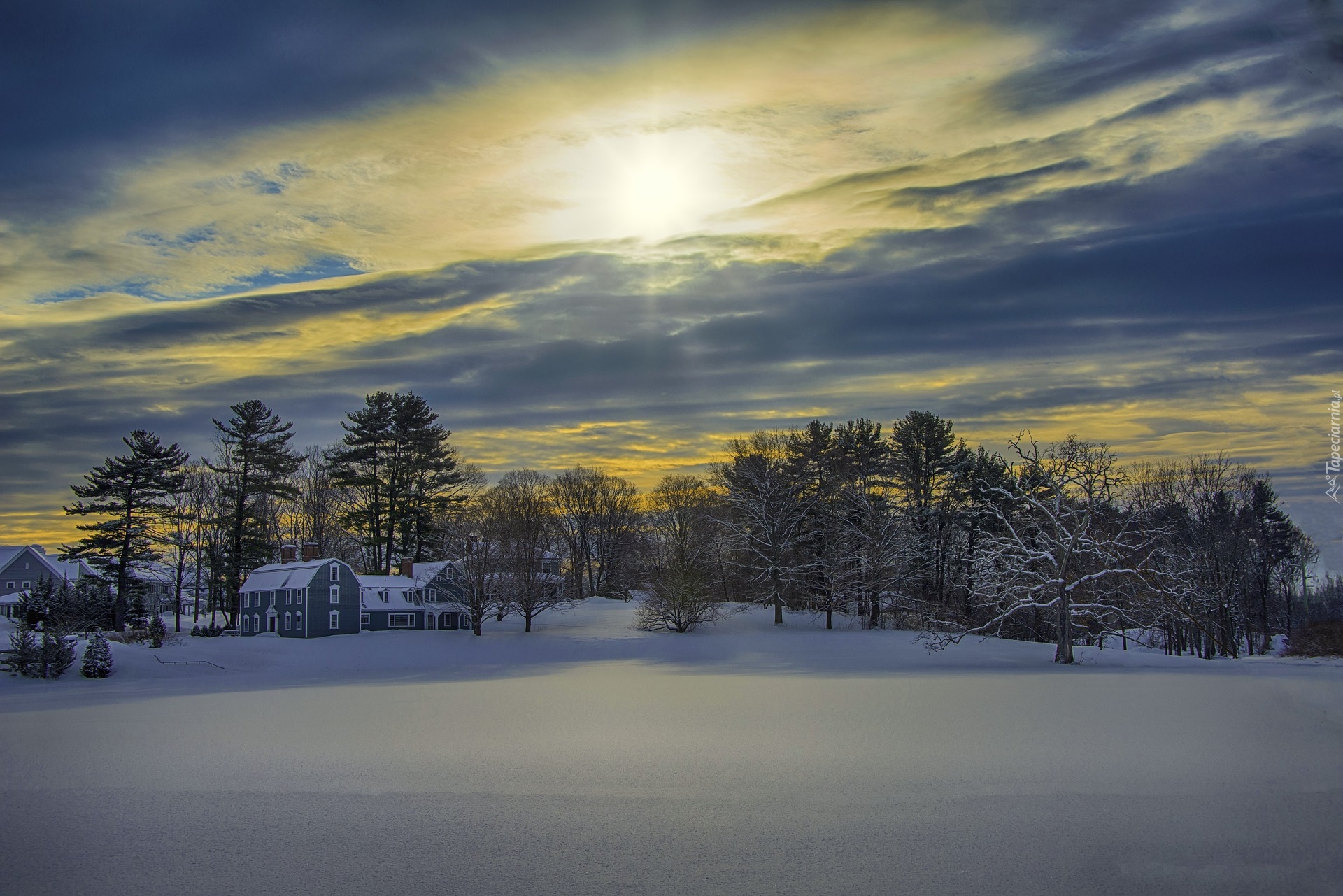Edytor tapety: Domy i drzewa w zimowej scenerii