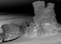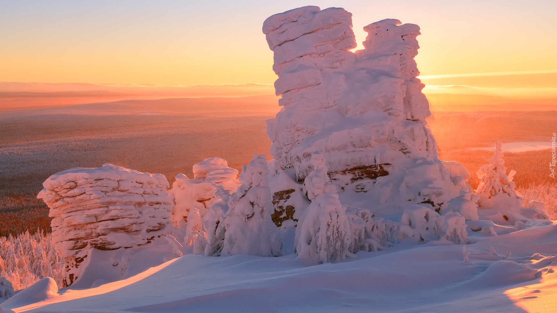 Edytor tapety: Ośnieżone skały w blasku wschodzącego słońca