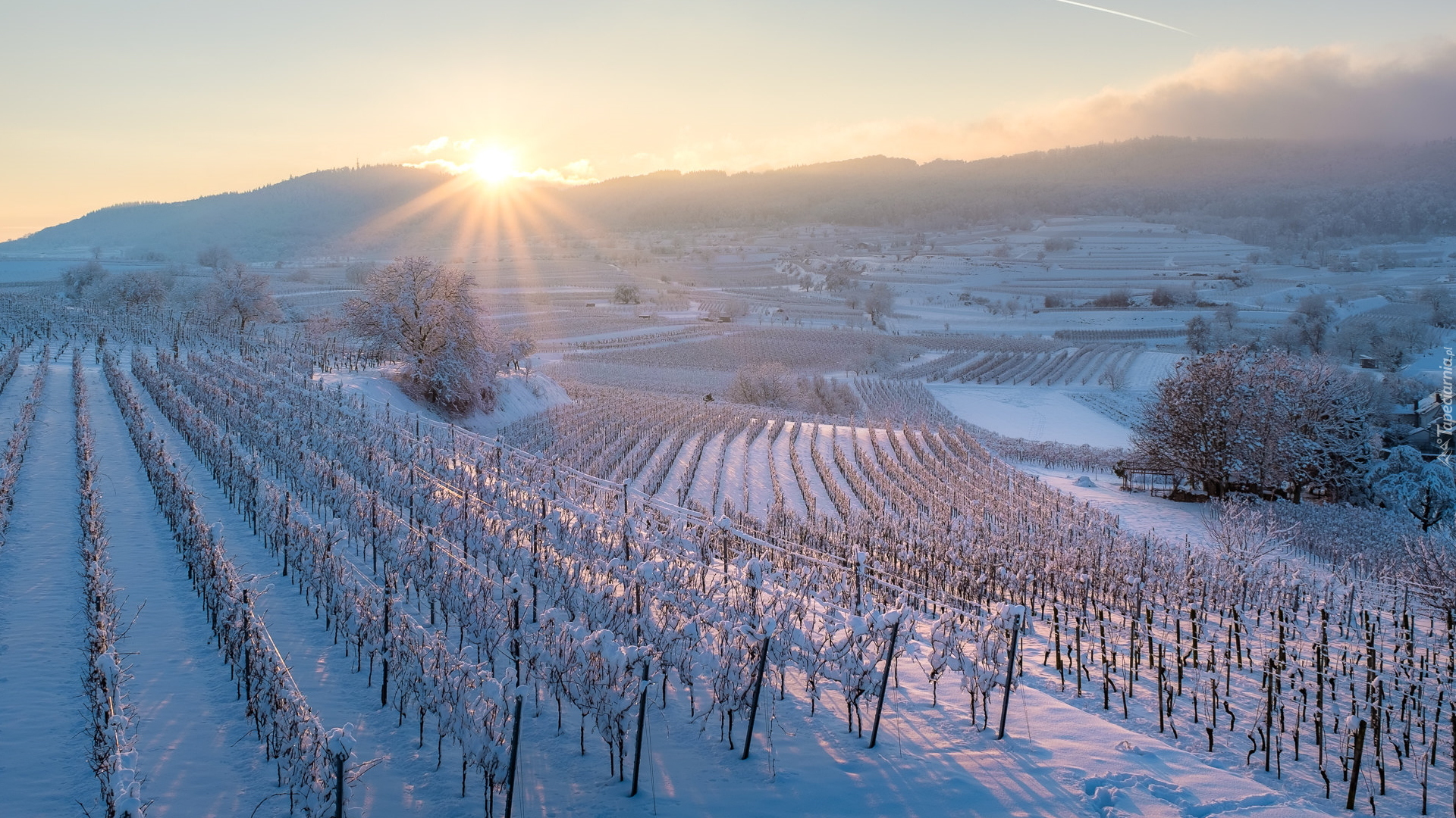 Edytor tapety: Zaśnieżone plantacje na tle gór Kaiserstuhl