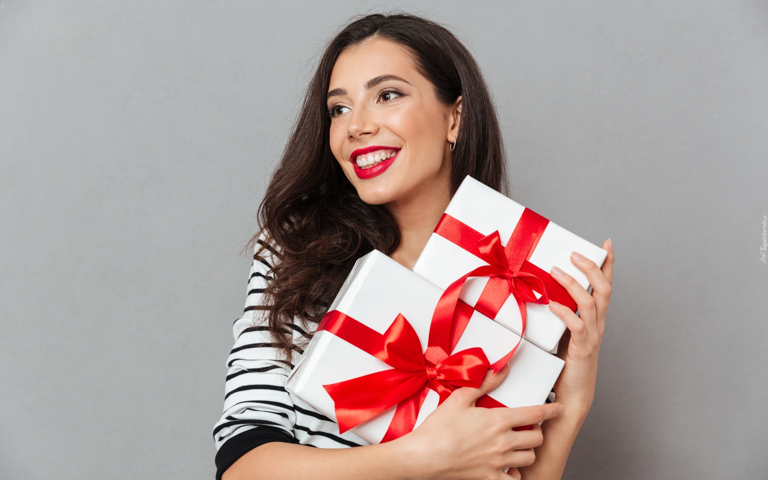 Edytor tapety: Uśmiechnięta kobieta z prezentami w rękach