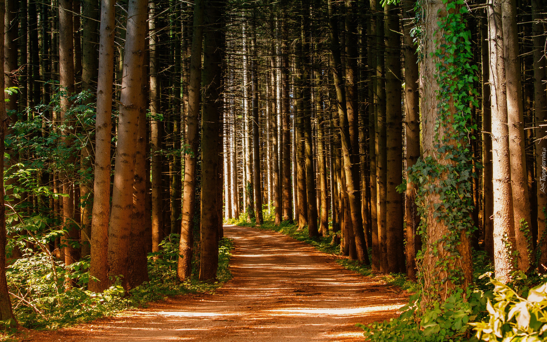 Edytor tapety: Wysokie drzewa po obu stronach leśnej ścieżki
