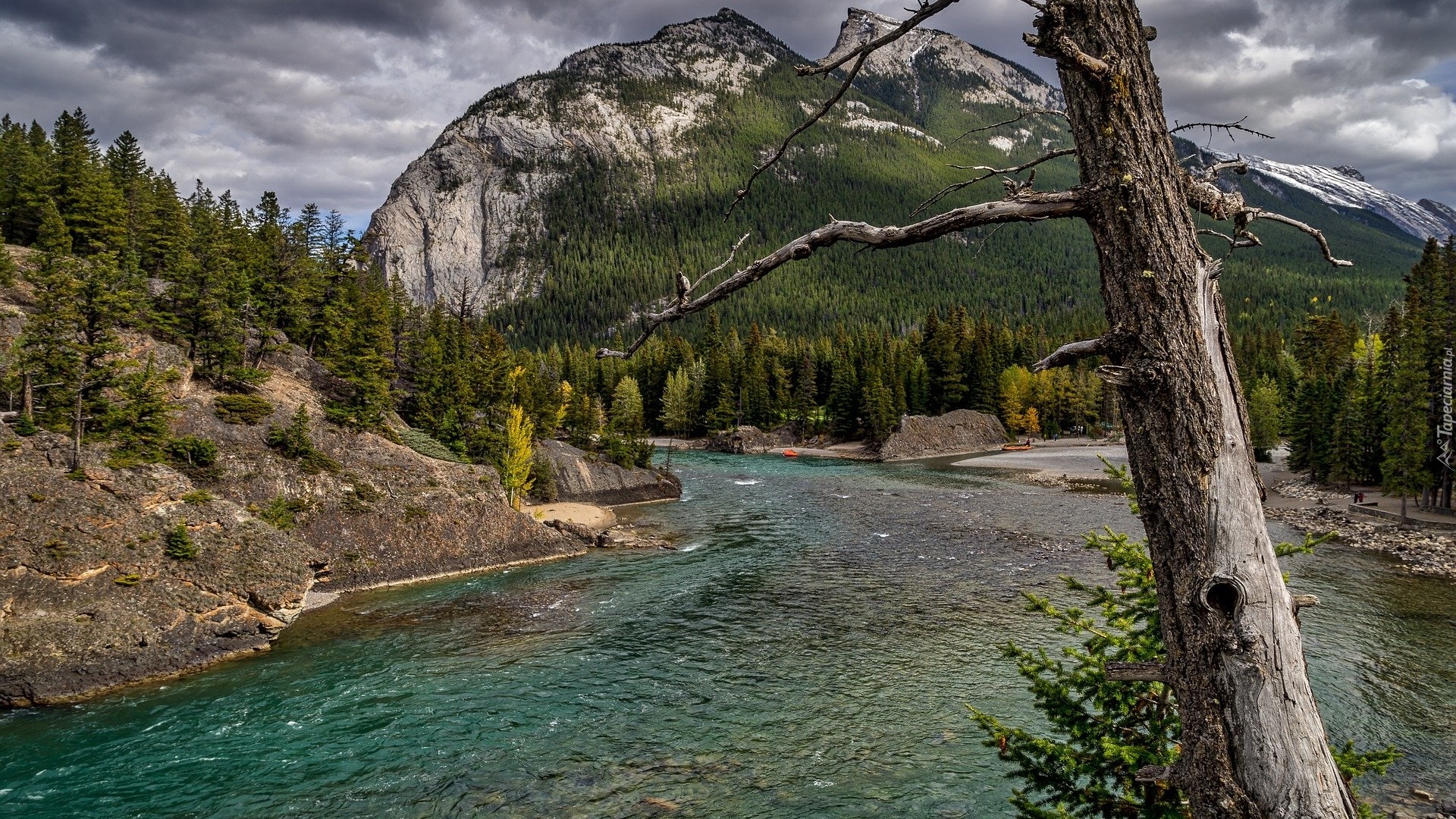 Edytor tapety: Zielone drzewa na skałach nad rzeką
