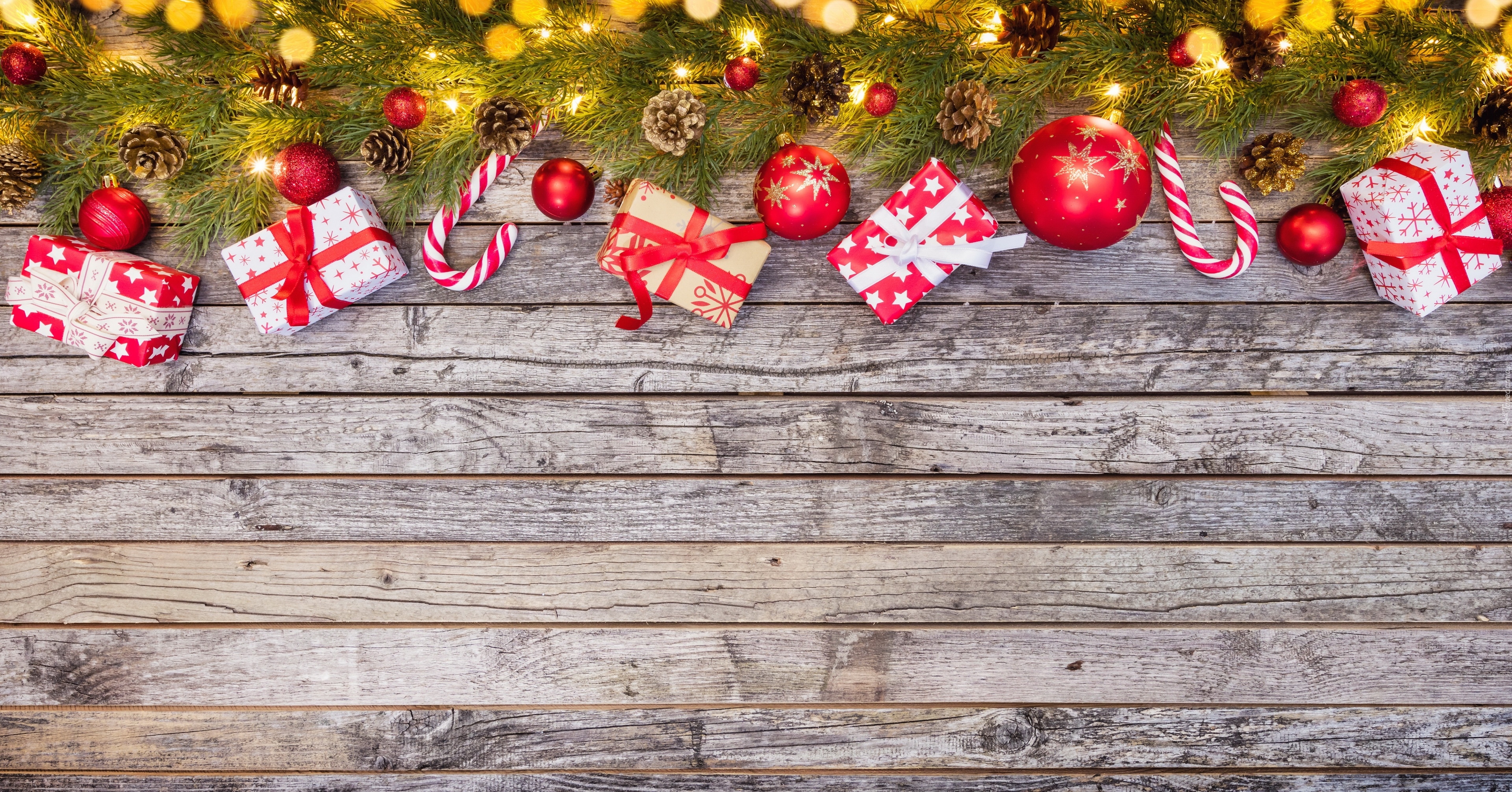 Edytor tapety: Prezenty i bombki pod oświetlonymi gałązkami na deskach