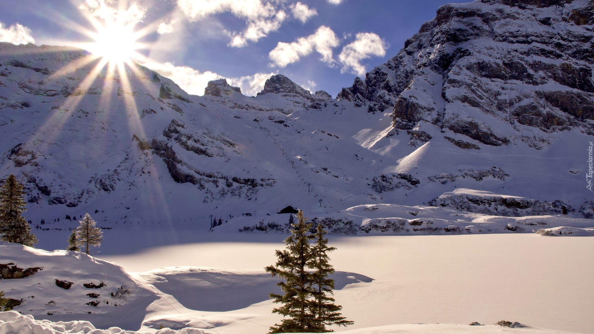 Edytor tapety: Słoneczne promienie nad ośnieżonymi górami