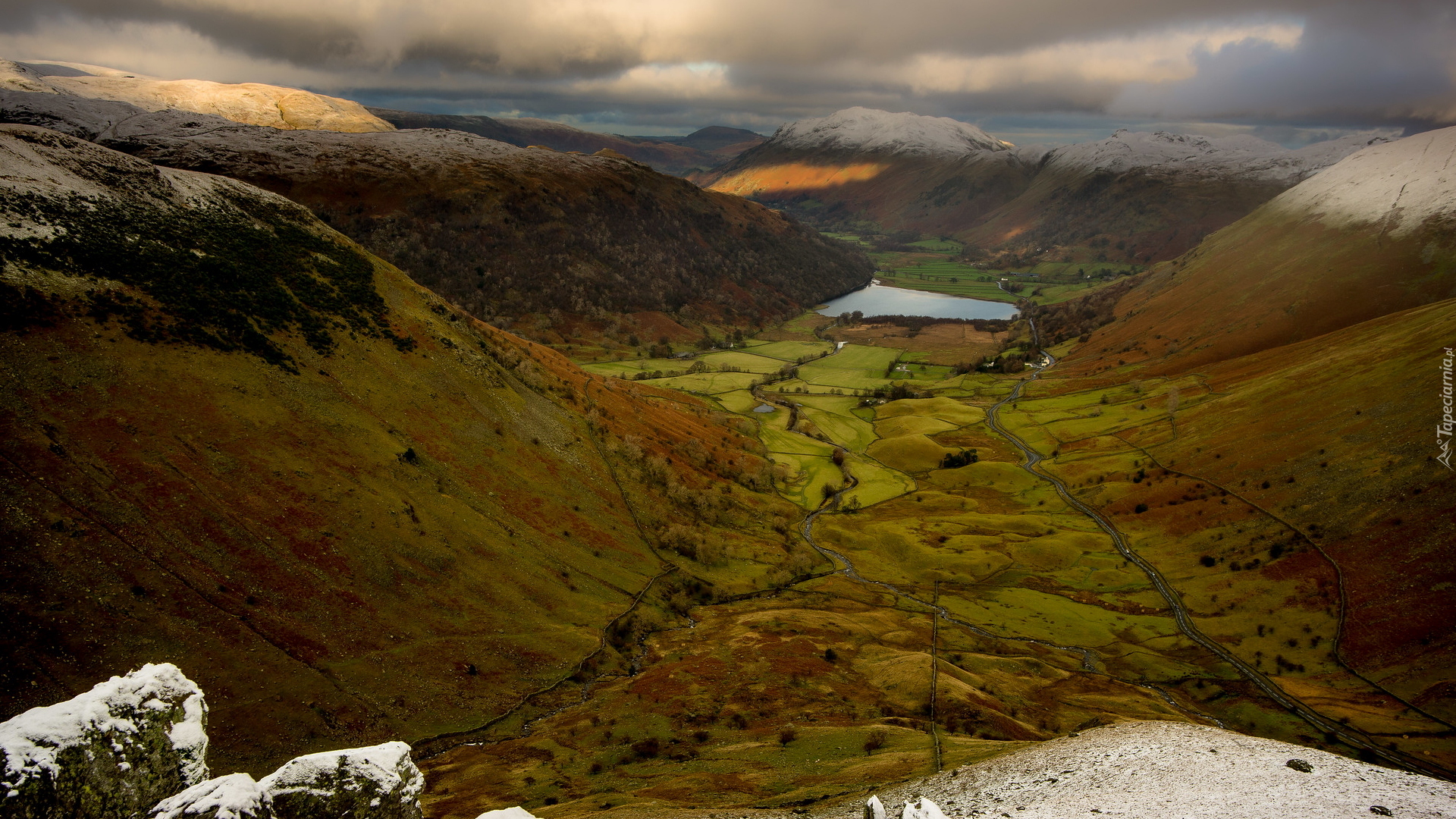 Edytor tapety: Pola uprawne i jezioro w górskiej dolinie