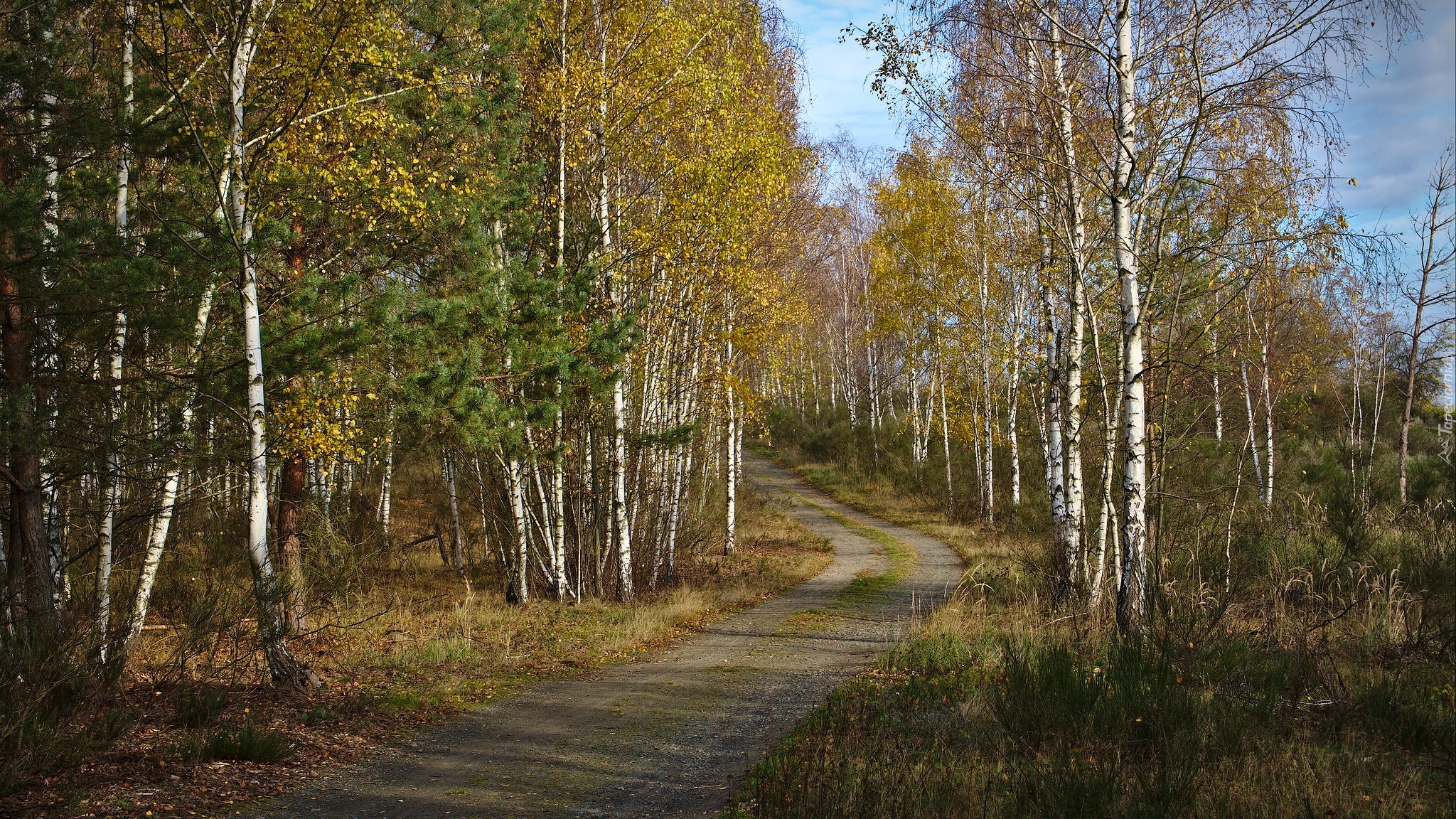 Edytor tapety: Jesienne brzozy po obu stronach drogi w lesie