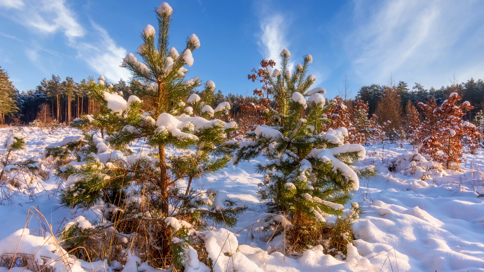 Edytor tapety: Zaśnieżone choinki w zimowy poranek