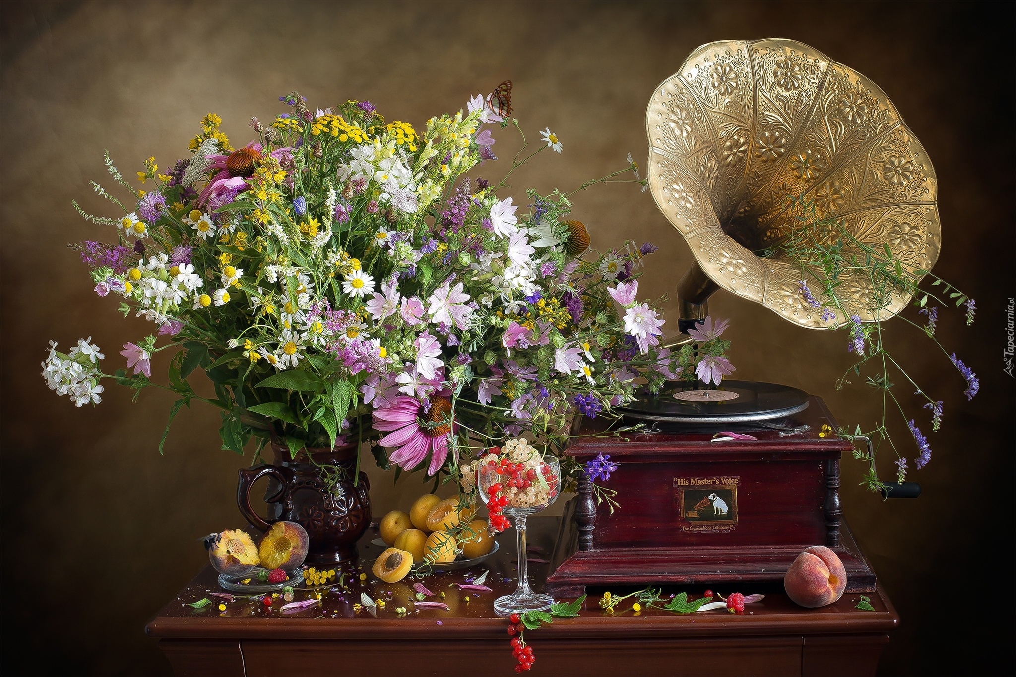Edytor tapety: Bukiet polnych kwiatów obok gramofonu i owoców