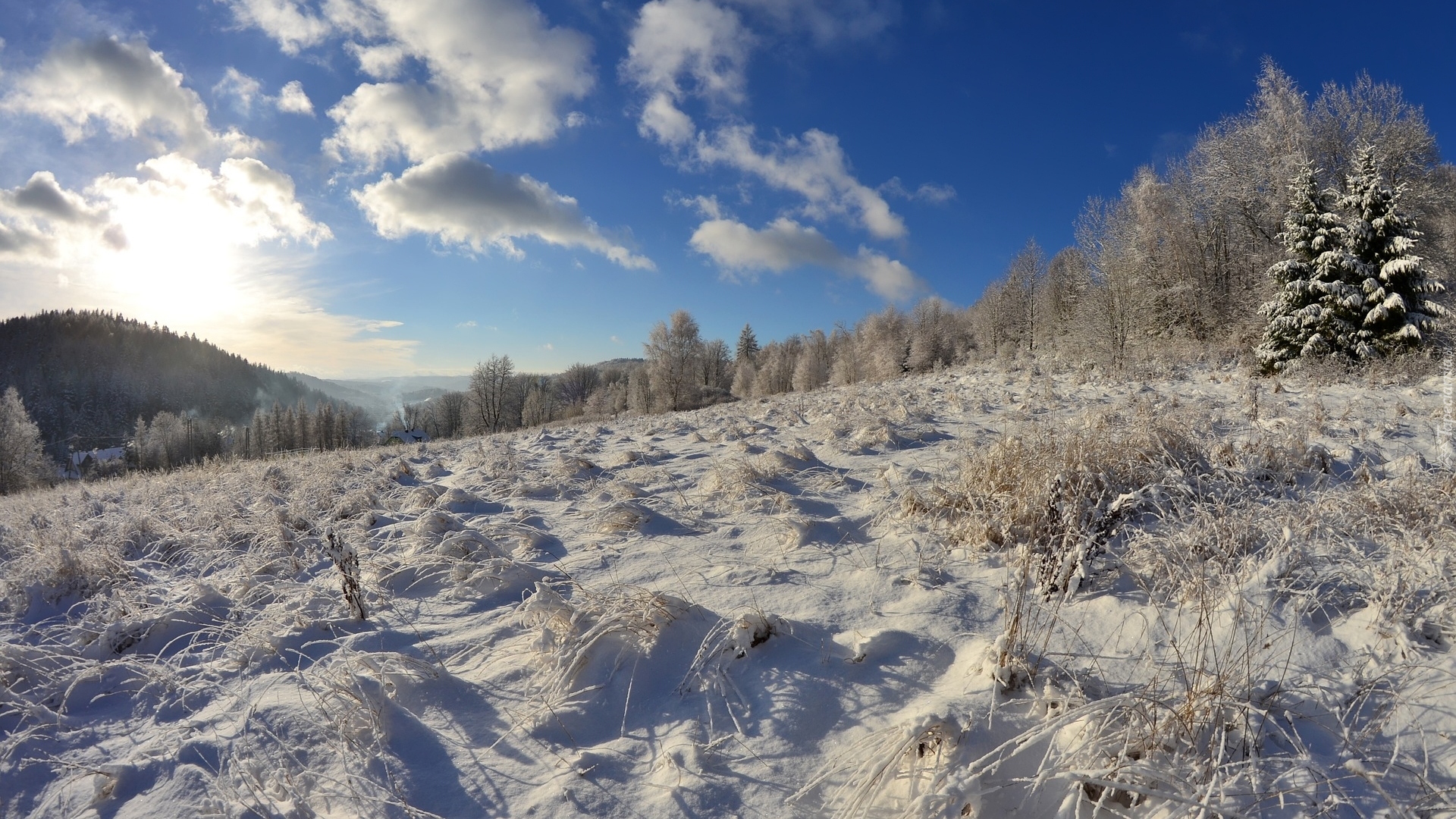 Edytor tapety: Oszronione drzewa i trawy na wzgórzu