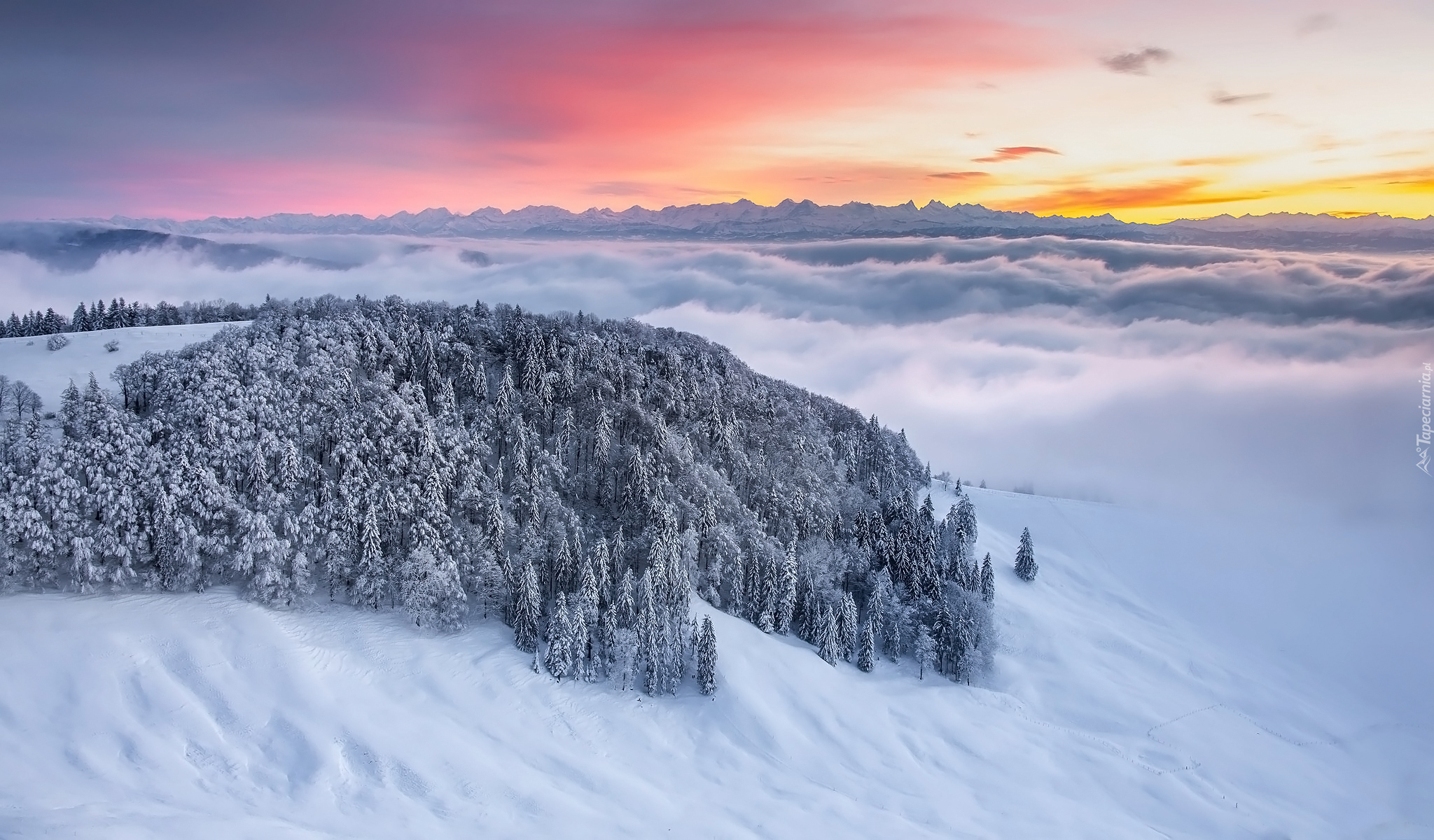 Edytor tapety: Ośnieżony las na tle gęstej mgły nad górami