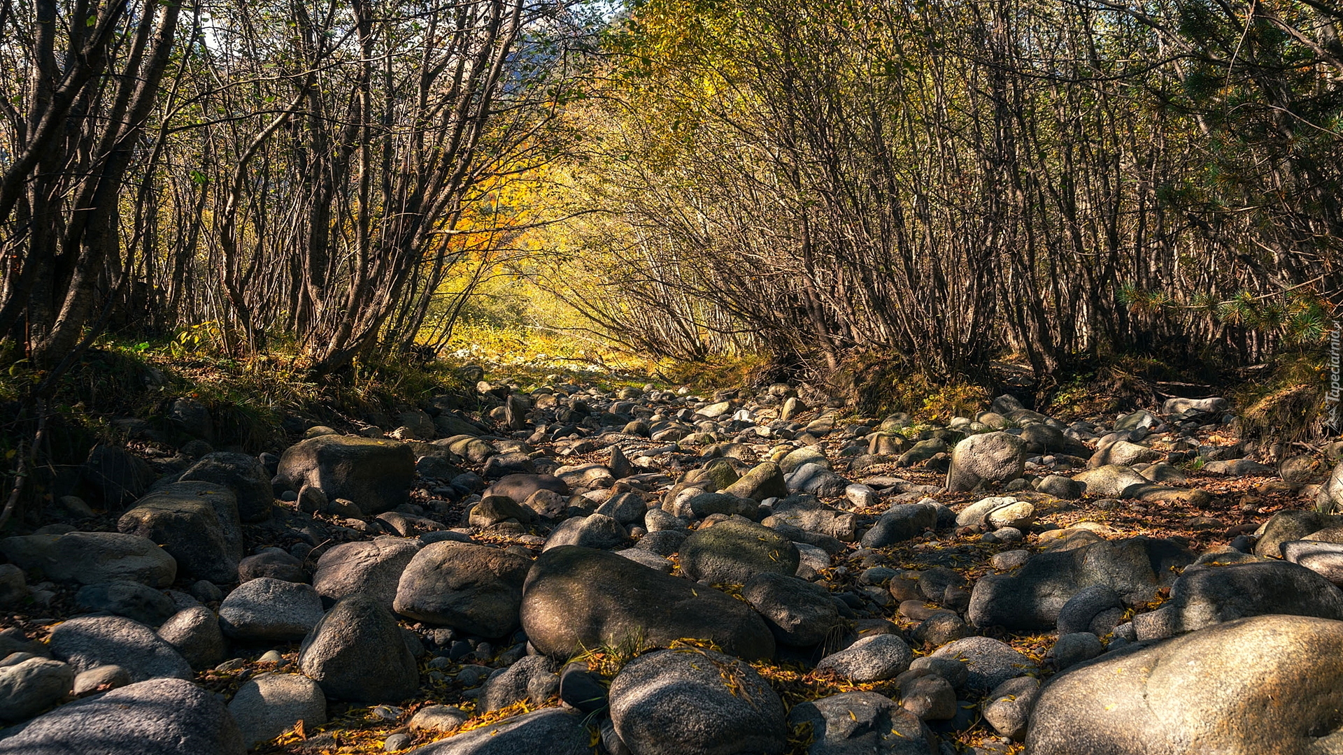 Edytor tapety: Kamienie pod jesiennymi krzewami w słonecznym blasku
