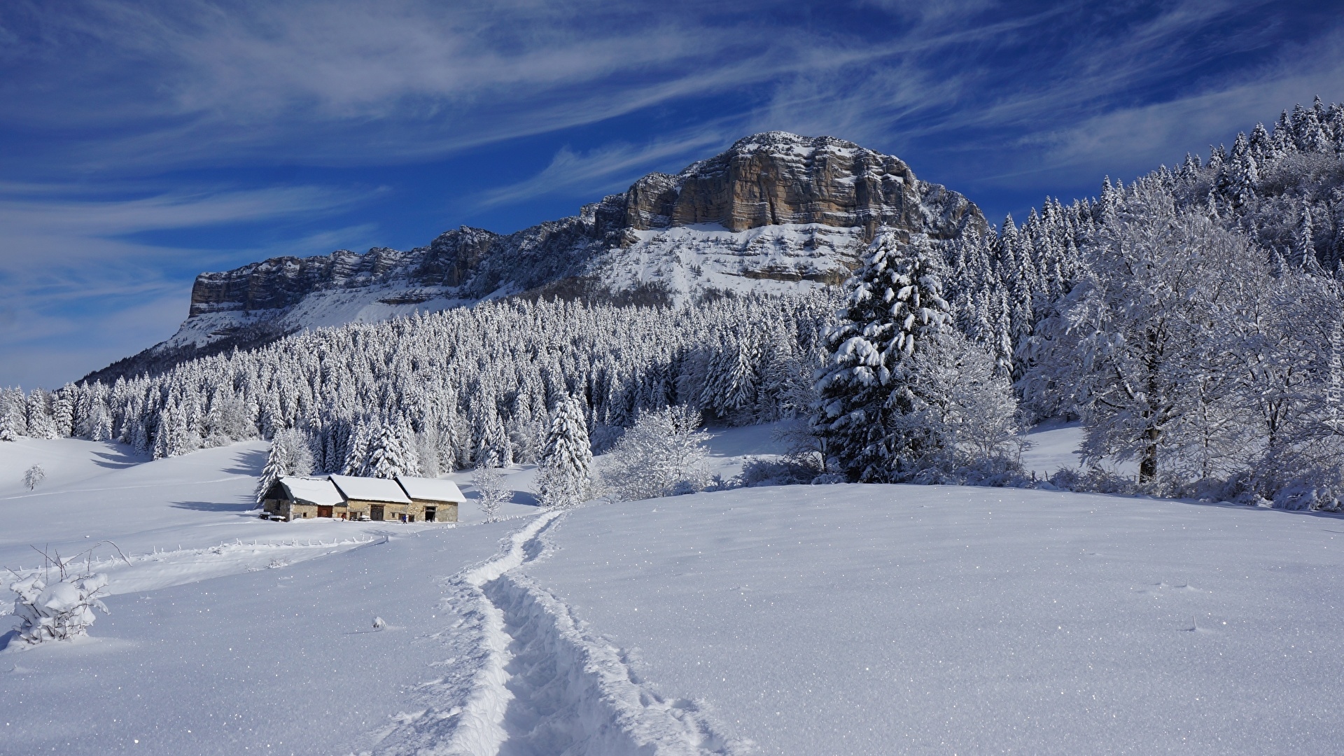 Edytor tapety: Ścieżka w śniegu na tle lasu i gór