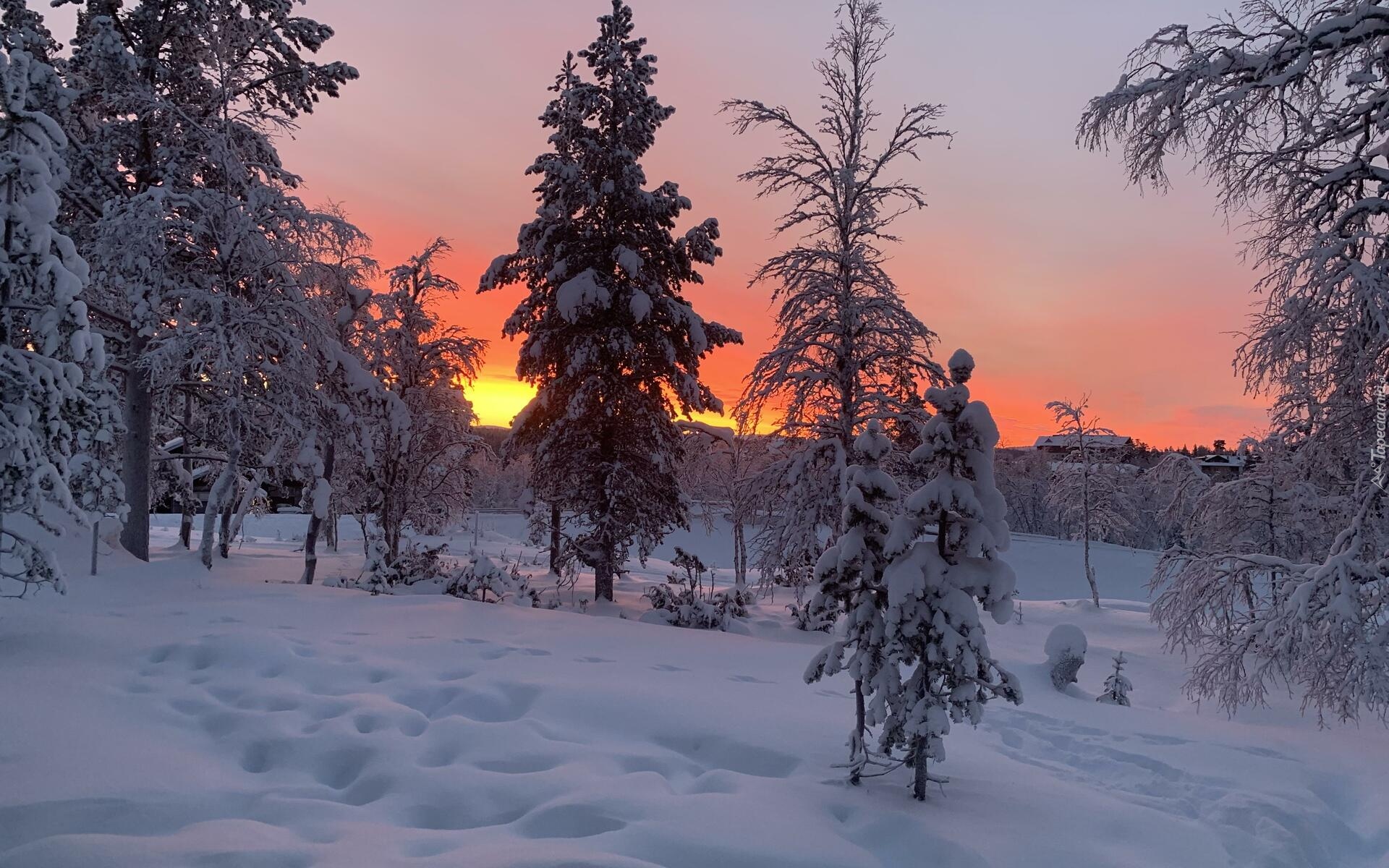 Edytor tapety: Ośnieżone drzewa na polu w blasku zachodzącego słońca