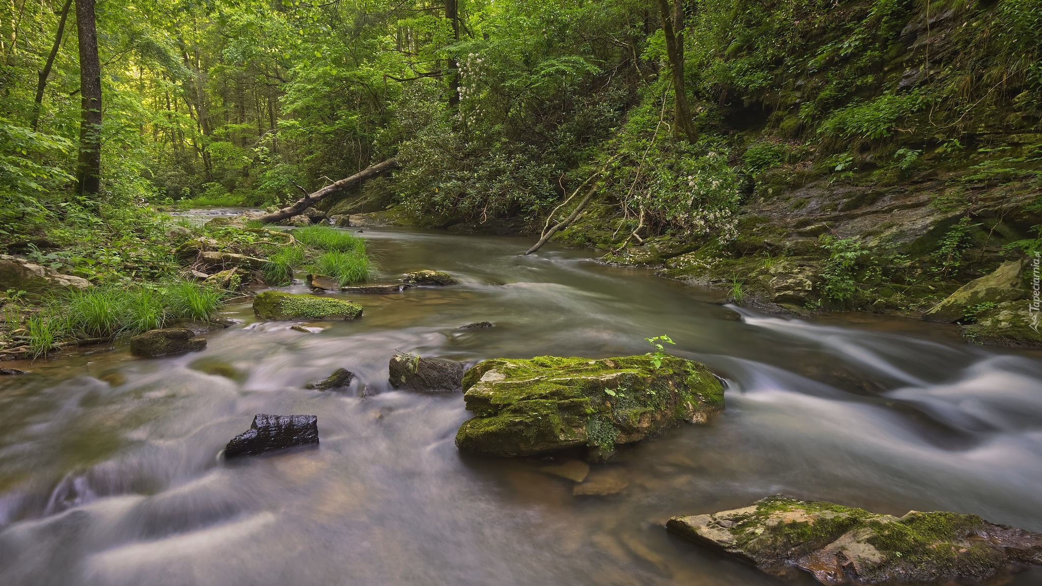 Edytor tapety: Omszałe kamienie w rwącej leśnej rzece