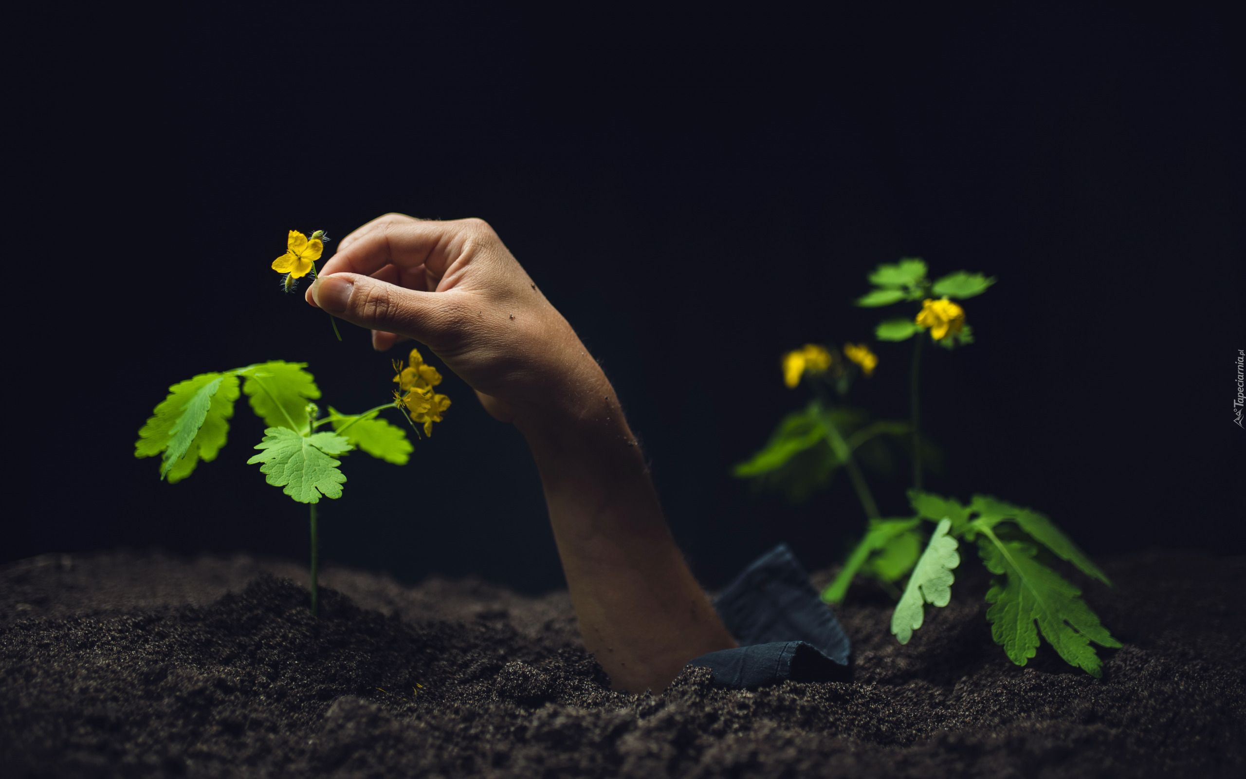 Edytor tapety: Dłoń wystająca z ziemi zrywająca żółte kwiatki