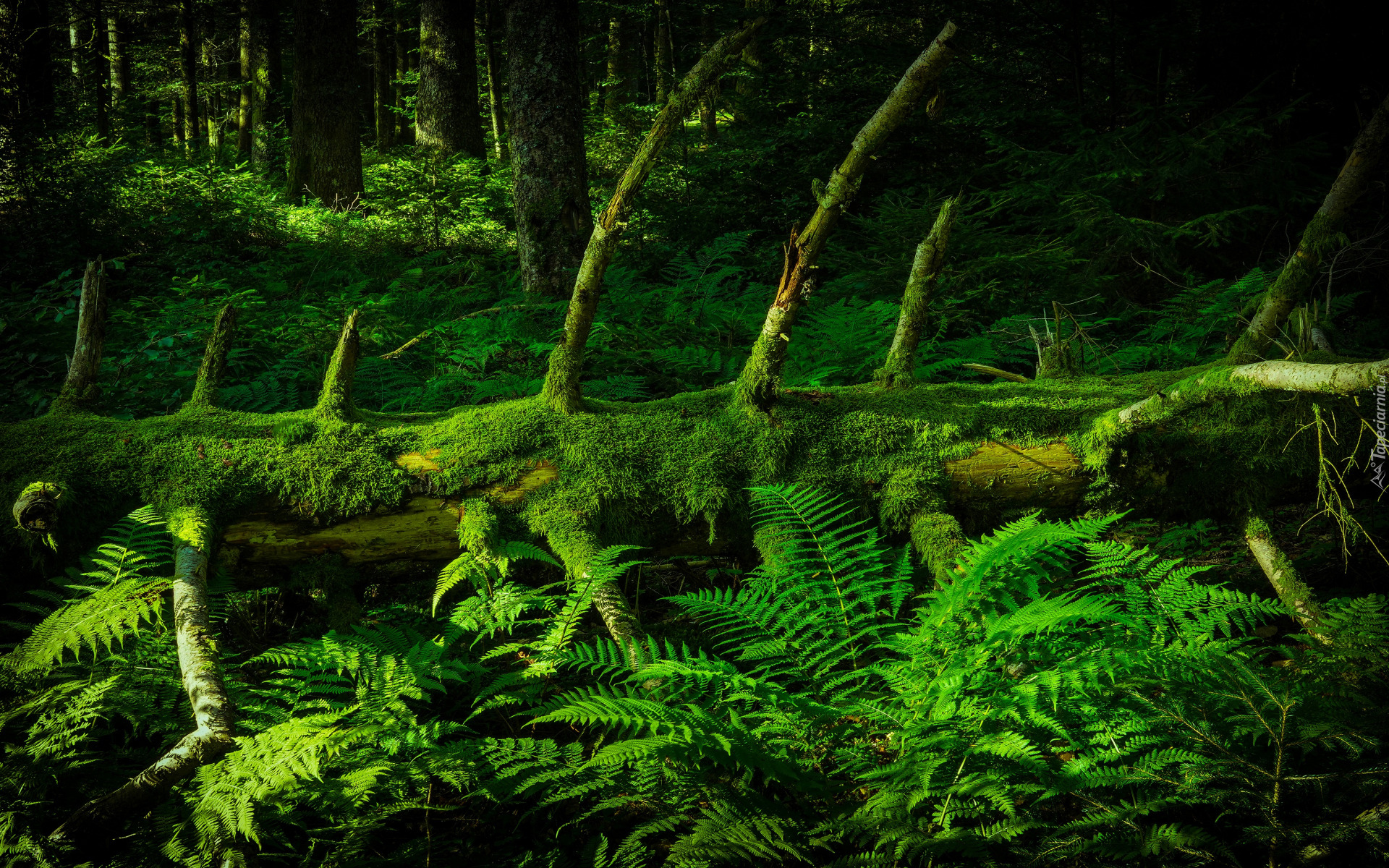 Edytor tapety: Omszały powalony pień drzewa obok paproci