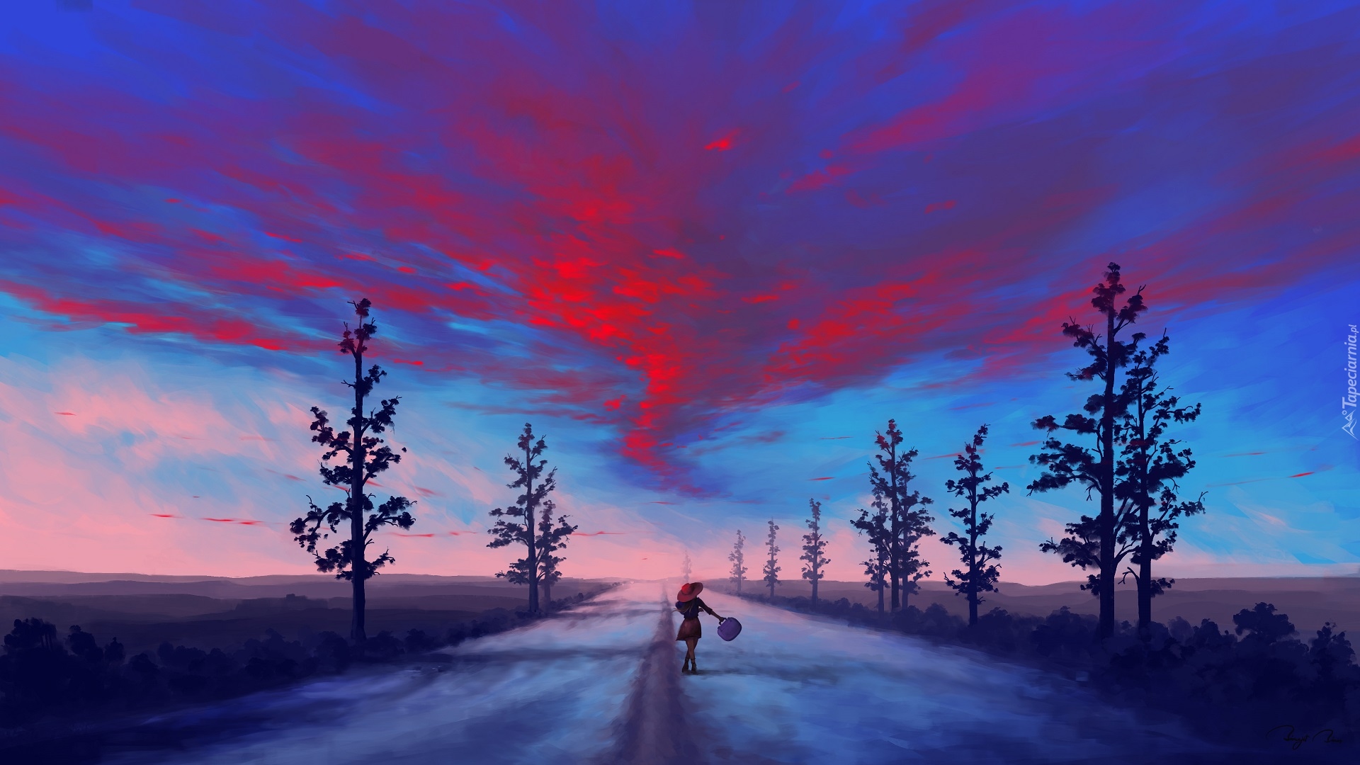 Edytor tapety: Dziewczyna idąca drogą pod czerwonawym niebem