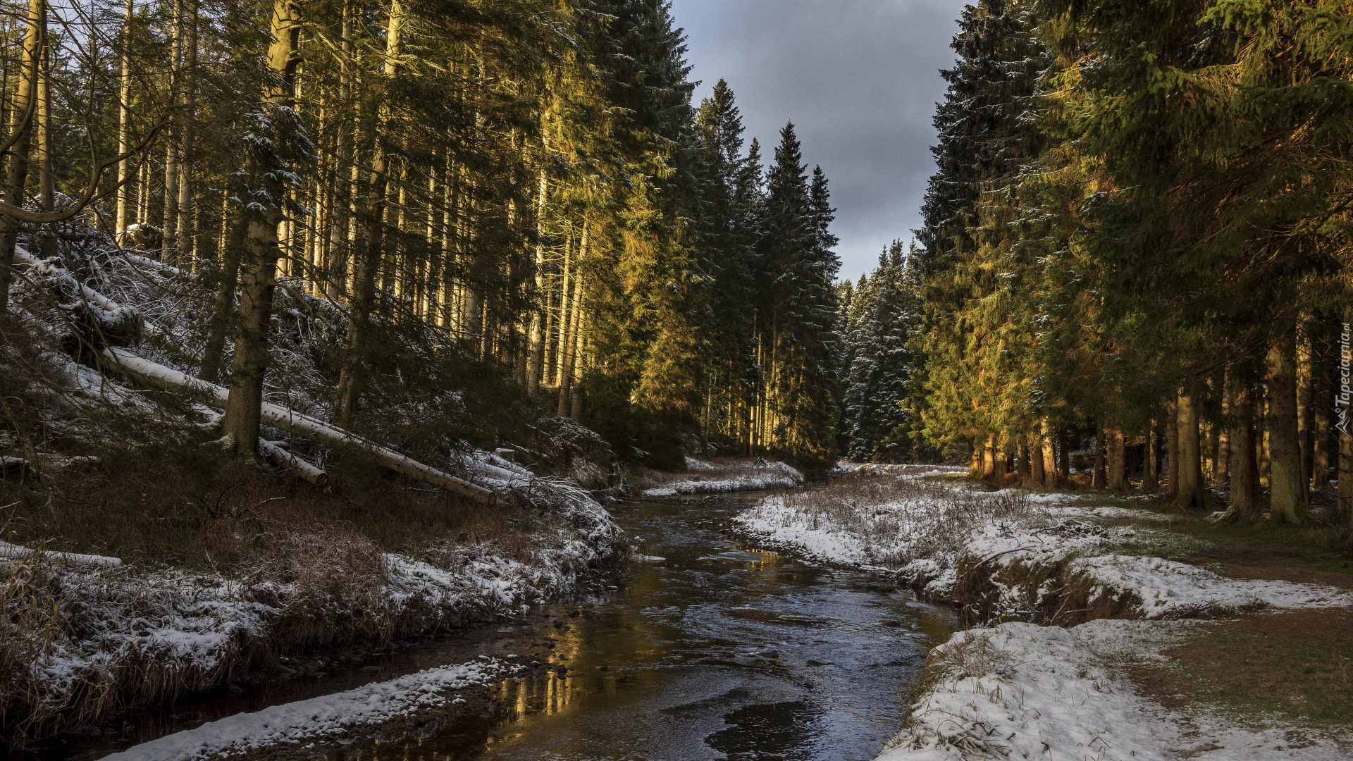 Edytor tapety: Ośnieżone brzegi rzeki w słonecznym lesie