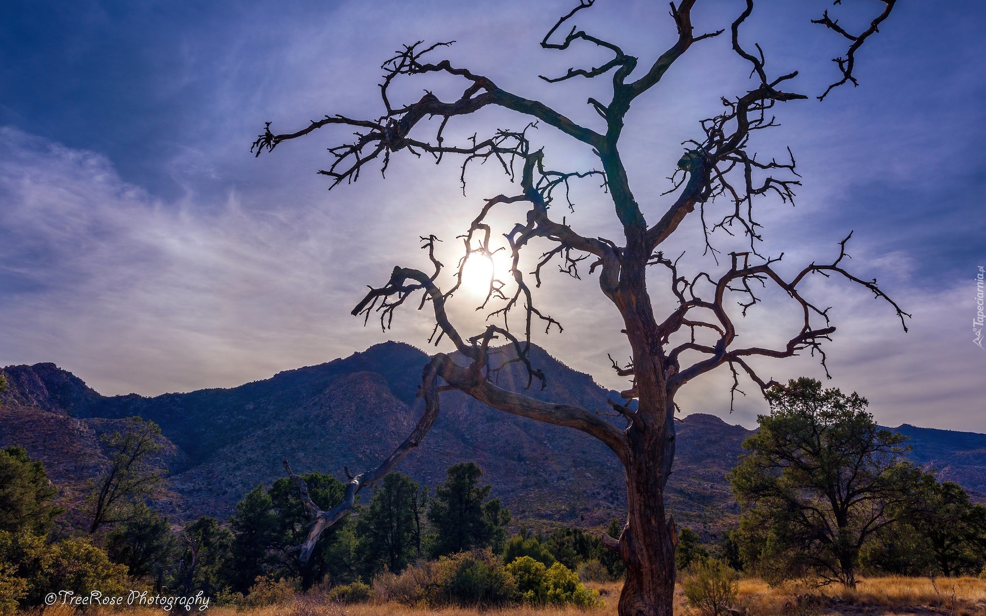 Edytor tapety: Bezlistne drzewo na tle gór