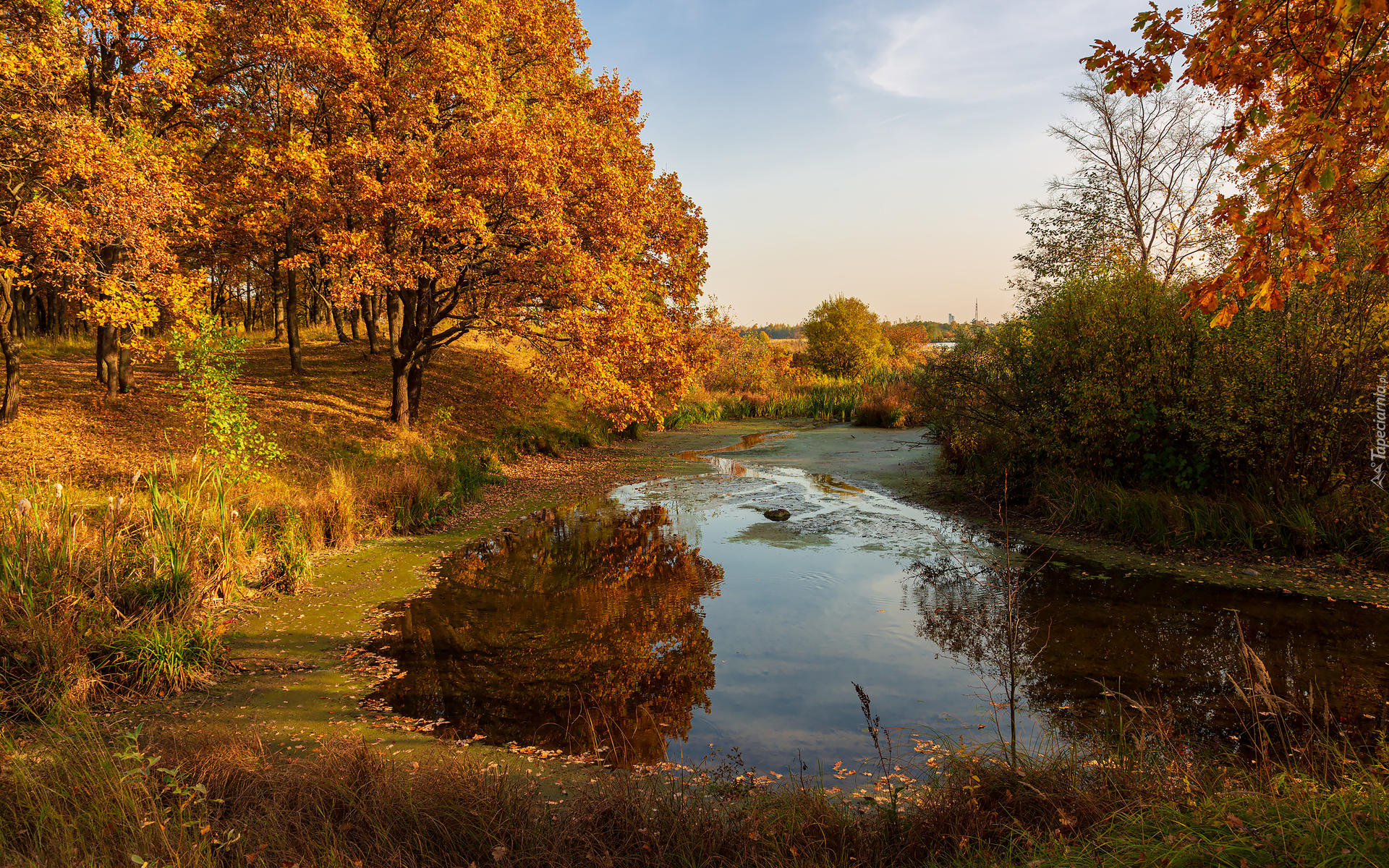 Edytor tapety: Rozświetlone pożółkłe drzewa nad stawem
