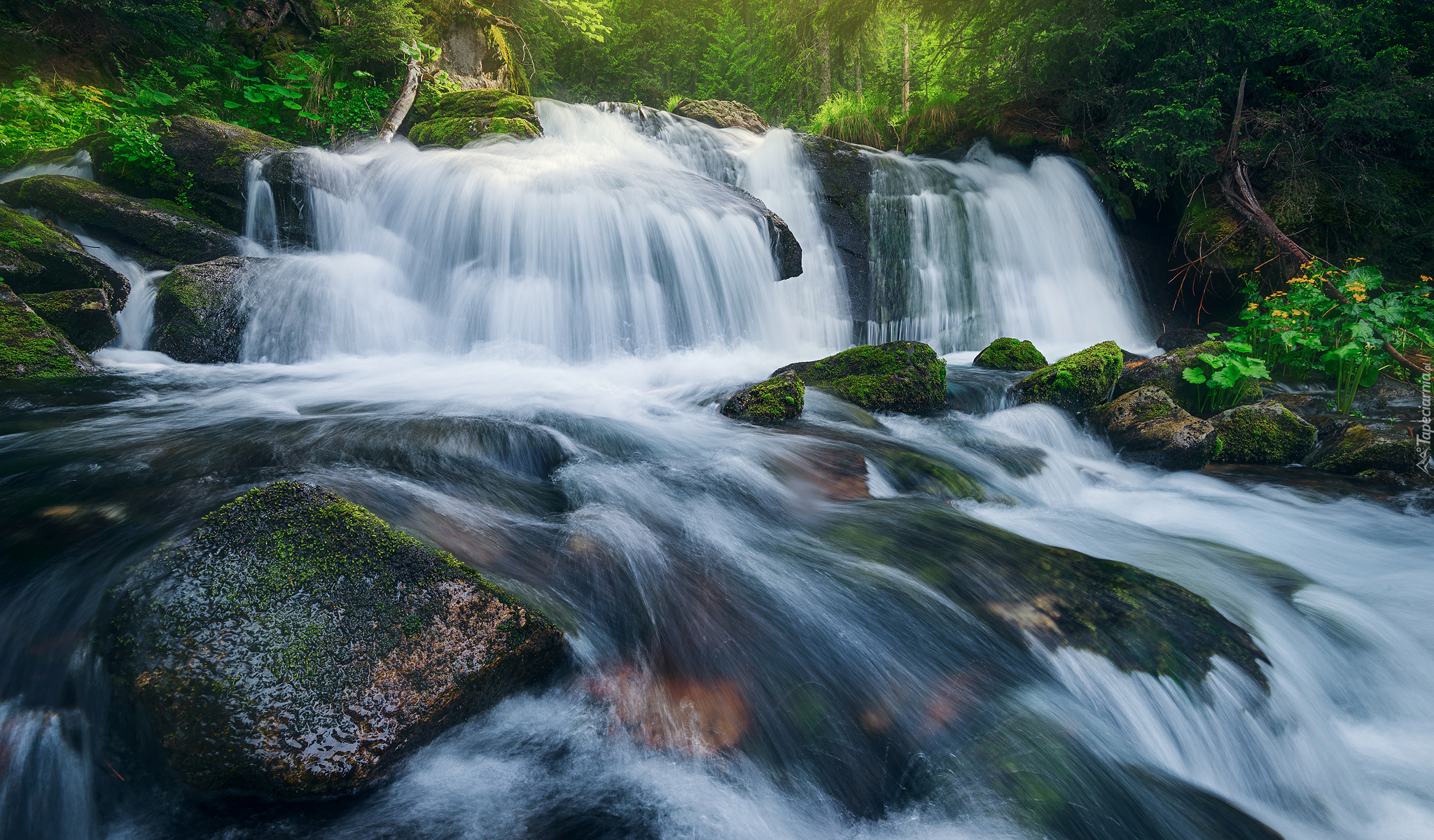 Edytor tapety: Omszałe głazy w leśnym wodospadzie