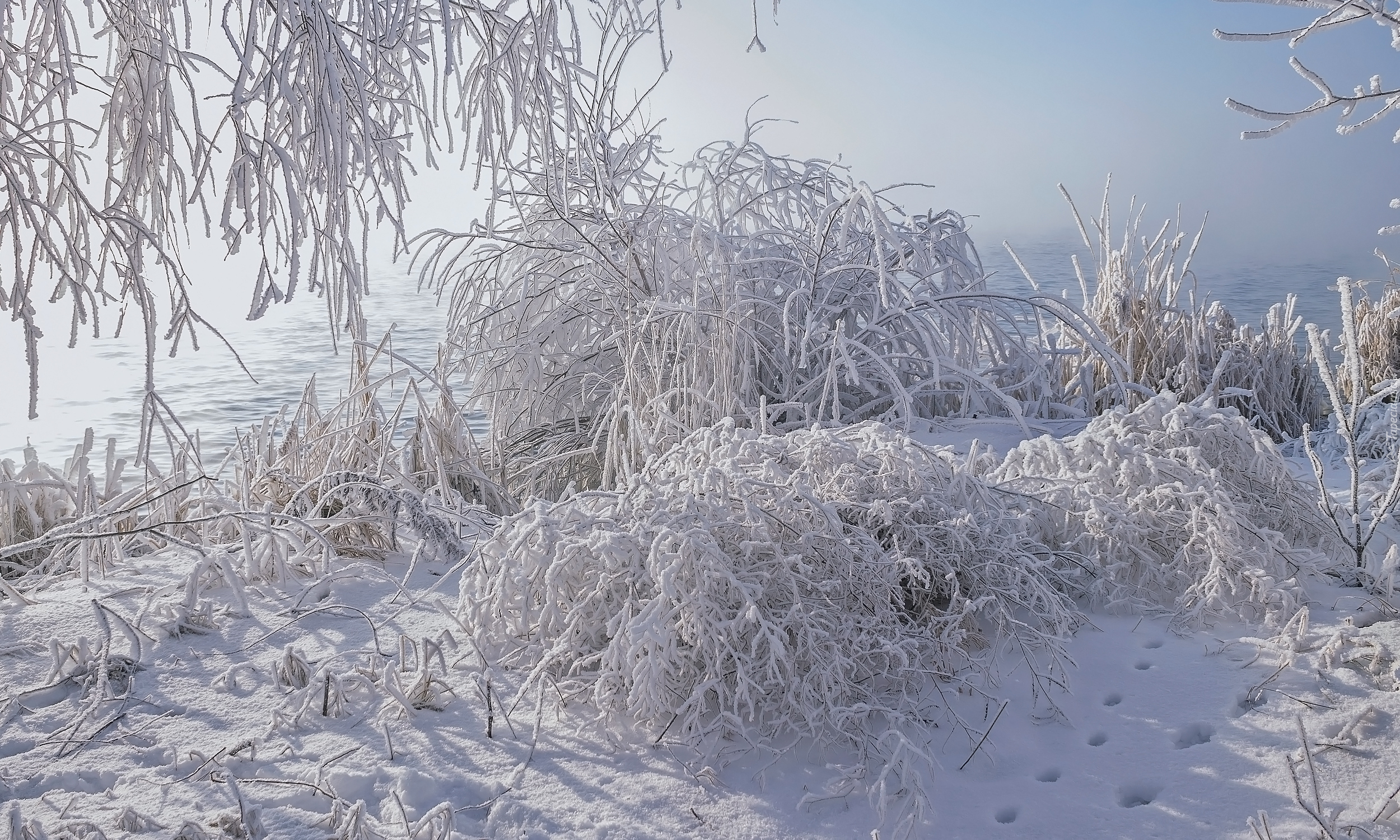 Edytor tapety: Ośnieżone krzewy nad rzeką