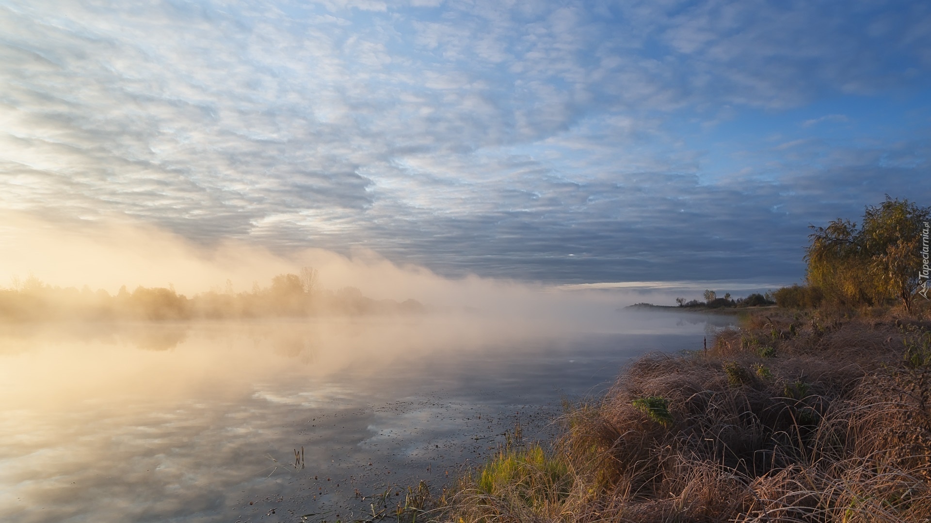 Edytor tapety: Gęsta mgła nad rzeką o poranku