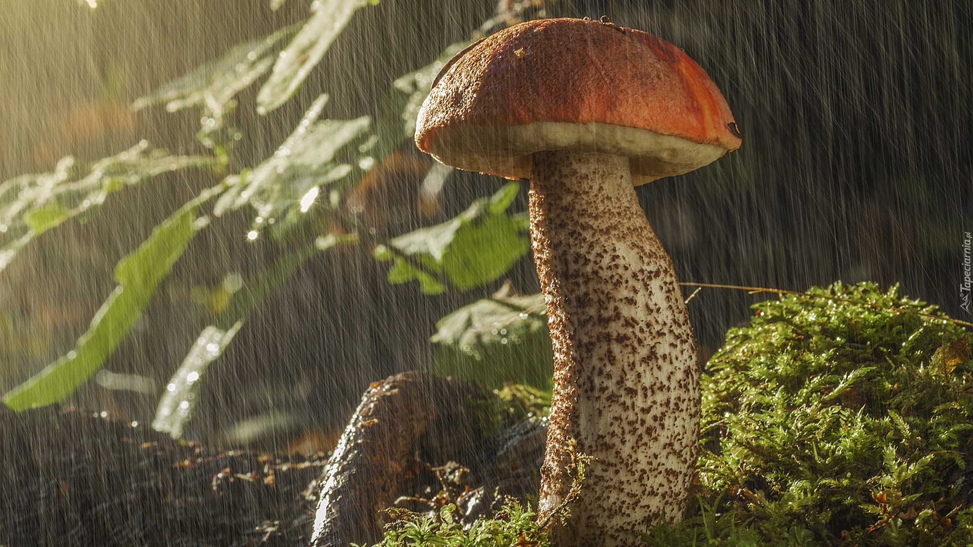 Edytor tapety: Koźlarz czerwony na mchu w deszczu