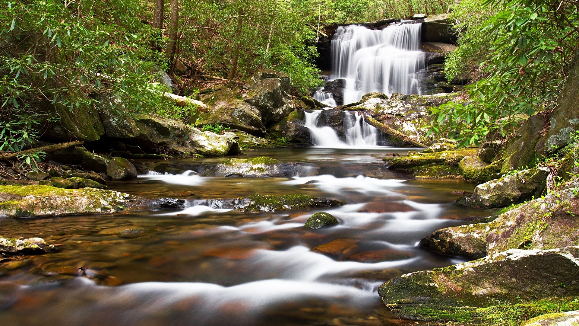 Edytor tapety: Drzewa i skały przy wodospadzie