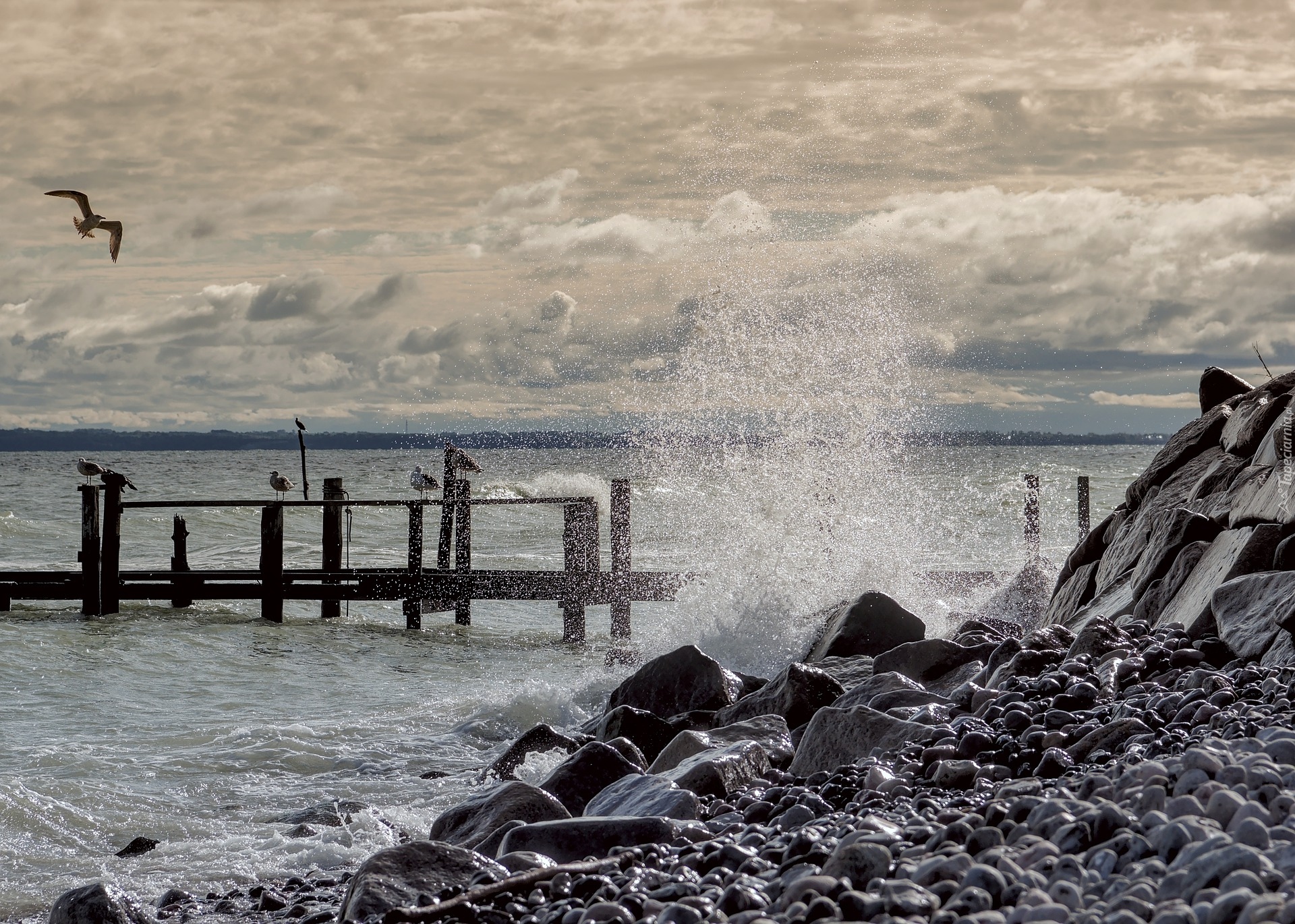 Edytor tapety: Mewy na pomoście i uderzające fale o kamienie