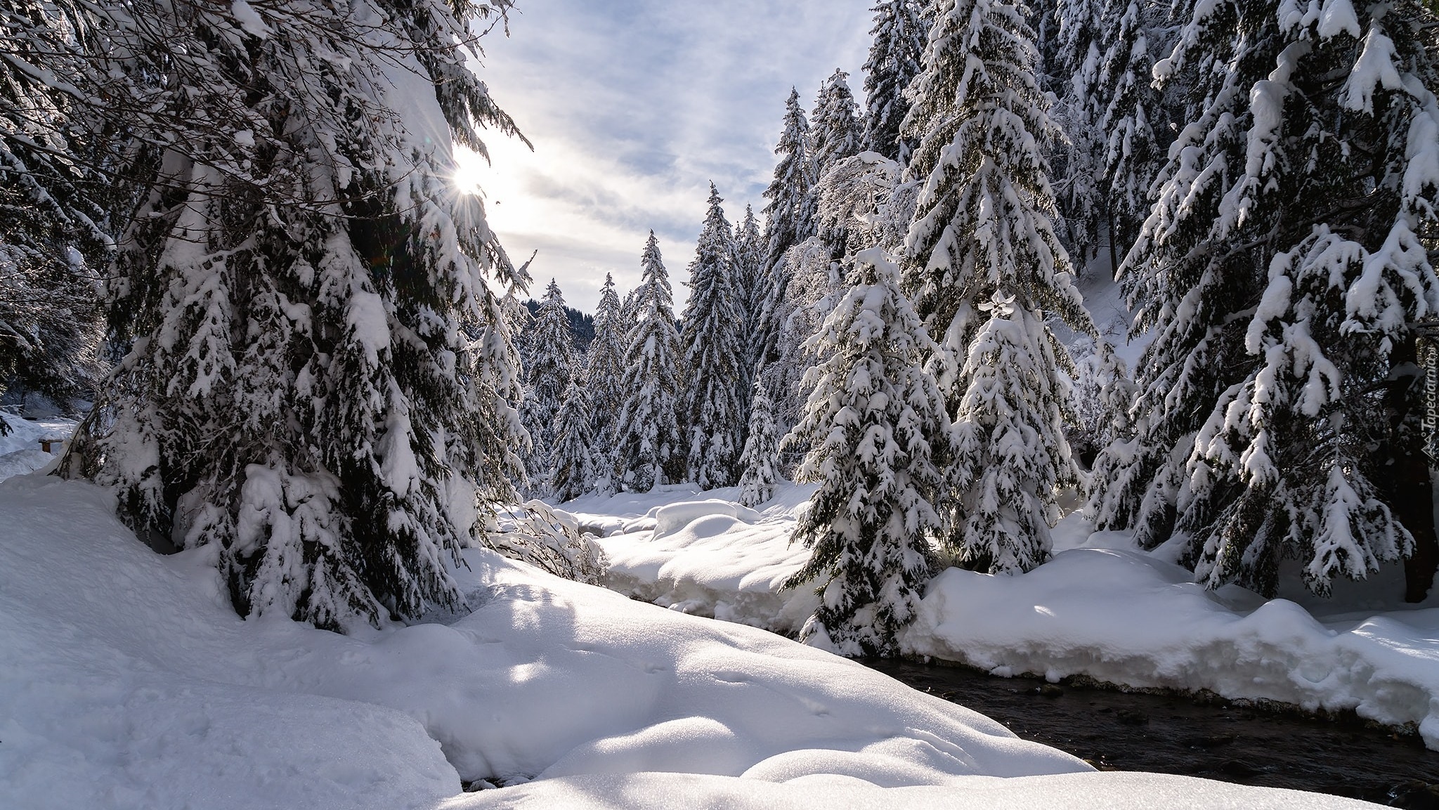Edytor tapety: Drzewa w głębokim śniegu po obu stronach rzeki