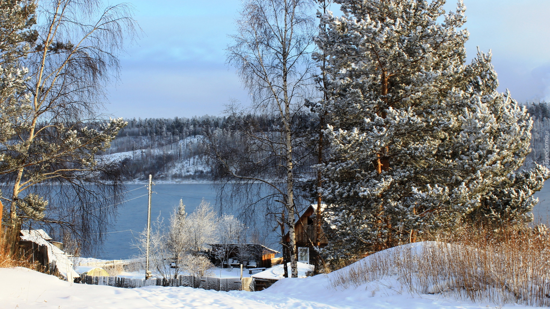 Edytor tapety: Domy pod ośnieżonymi drzewami nad rzeką