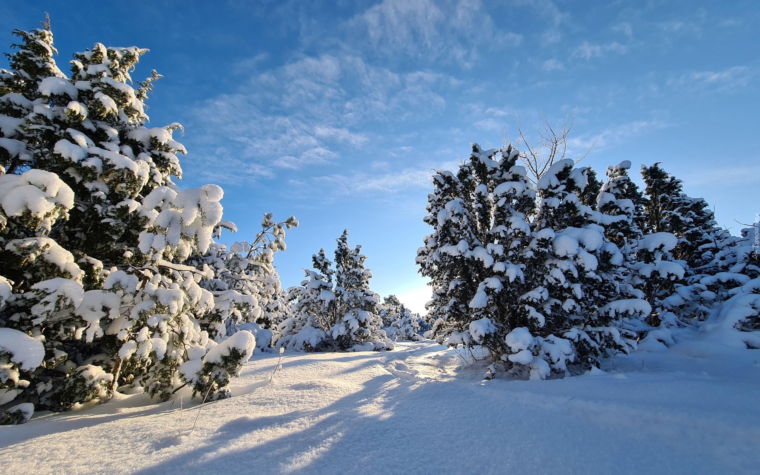Edytor tapety: Drzewa ośnieżone w słonecznym blasku