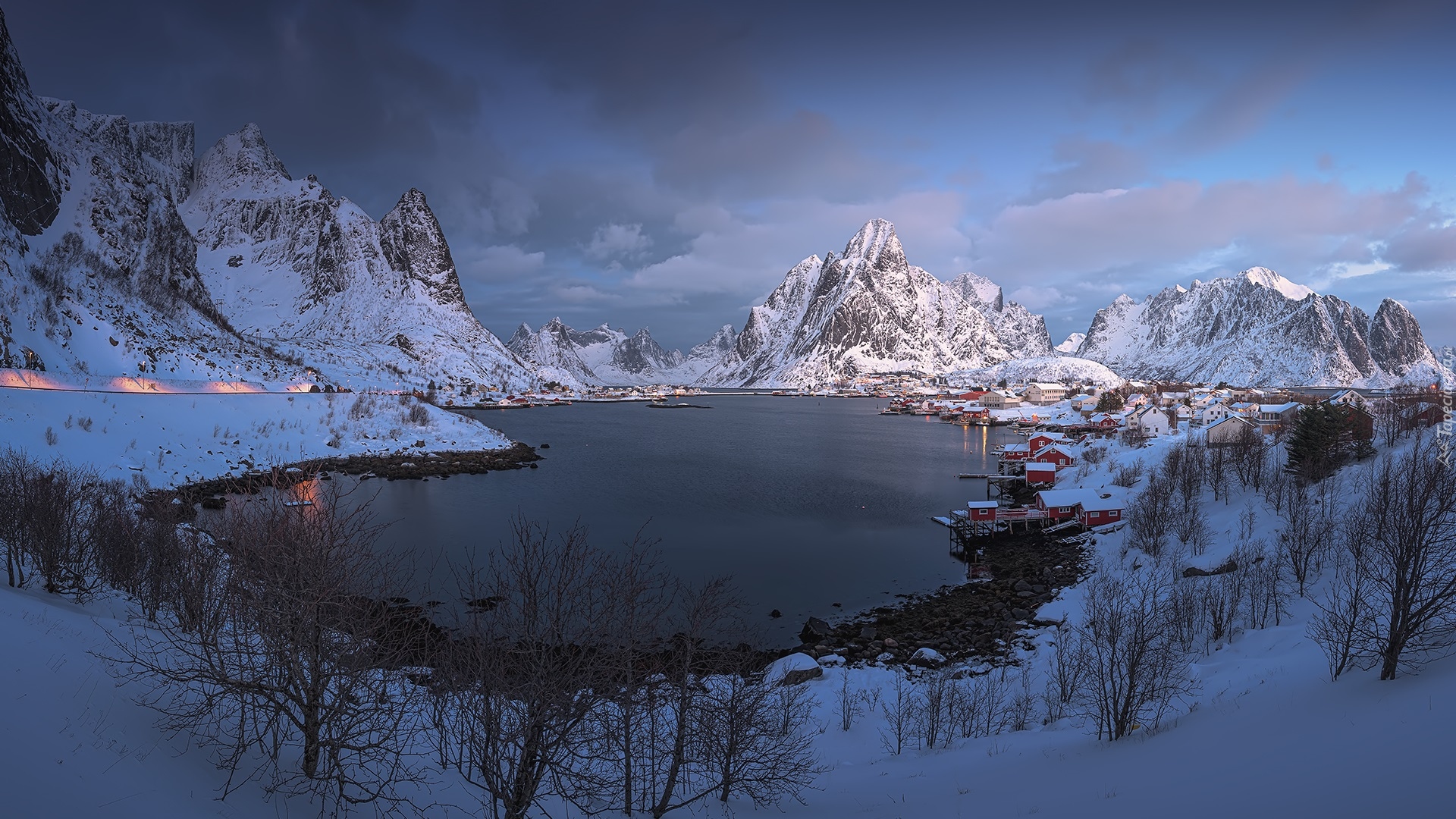 Edytor tapety: Widok na wioskę Reine i ośnieżone góry