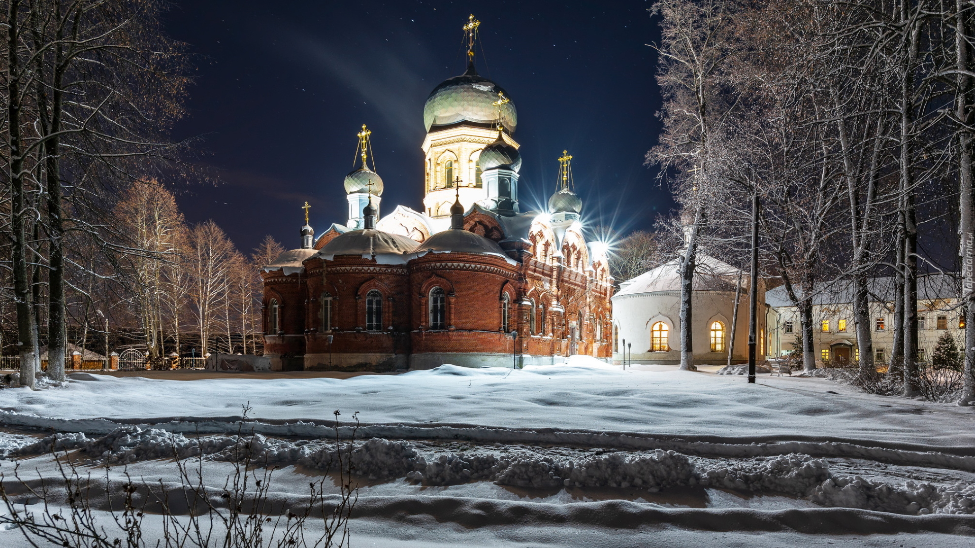 Edytor tapety: Oświetlona nocą cerkiew w zimowej scenerii