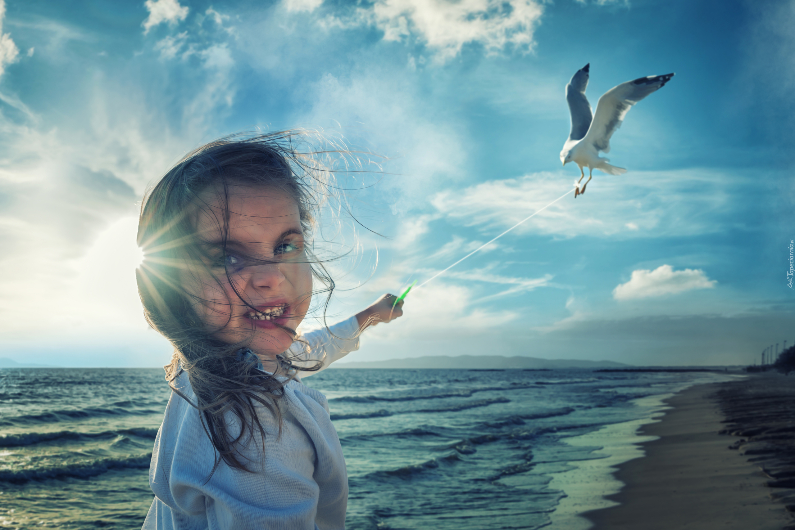 Edytor tapety: Dziewczynka nad morzem z mewą na sznurku