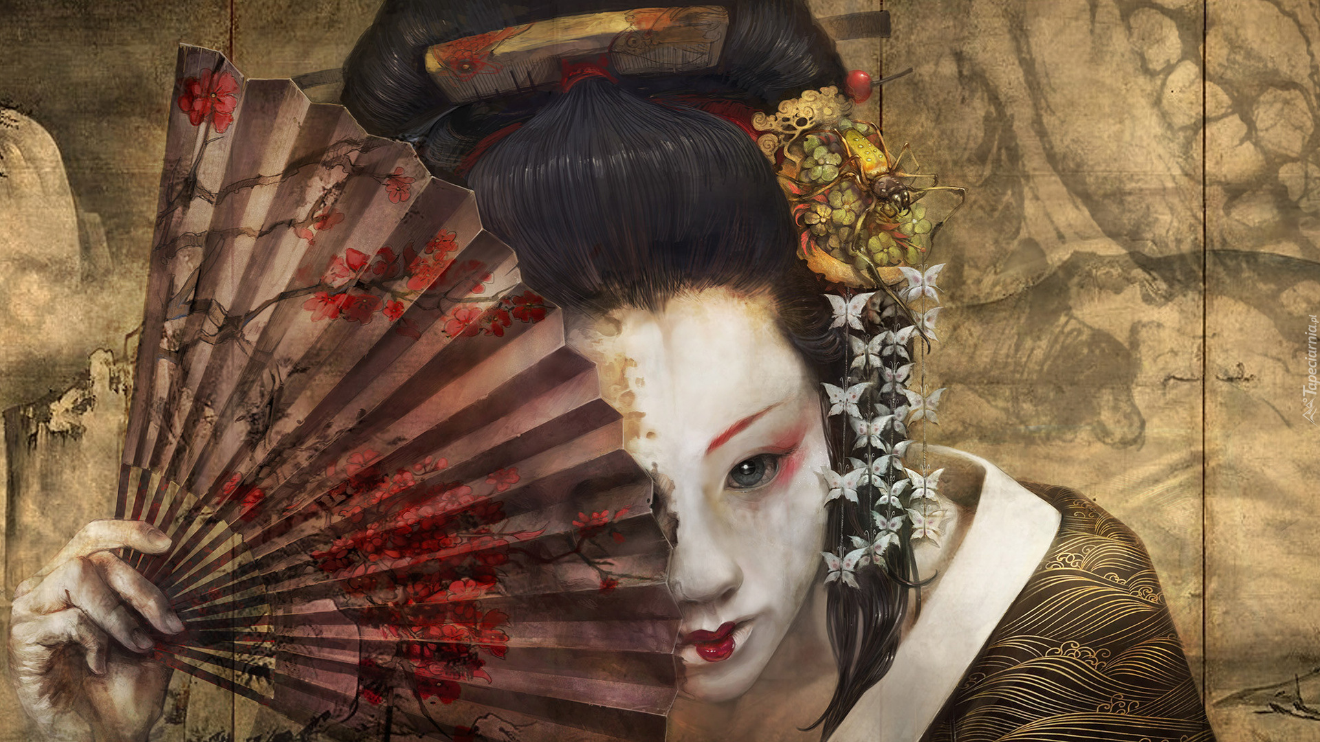 Edytor tapety: Gejsza z wachlarzem w grafice