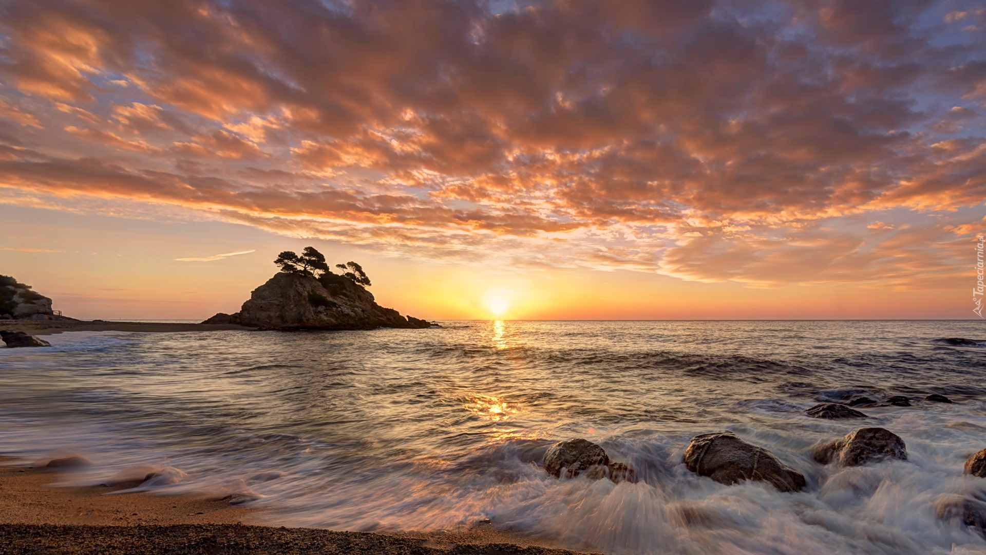 Edytor tapety: Widok z brzegu morza na zadrzewione skały