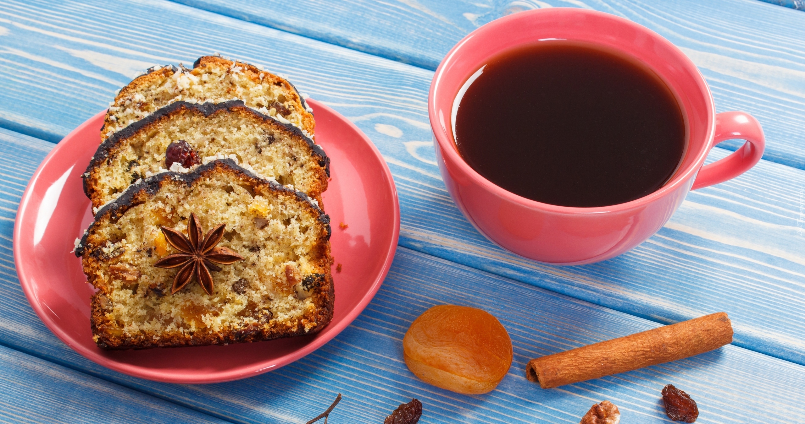 Edytor tapety: Kawałki keksa na talerzyku obok kubka kawy